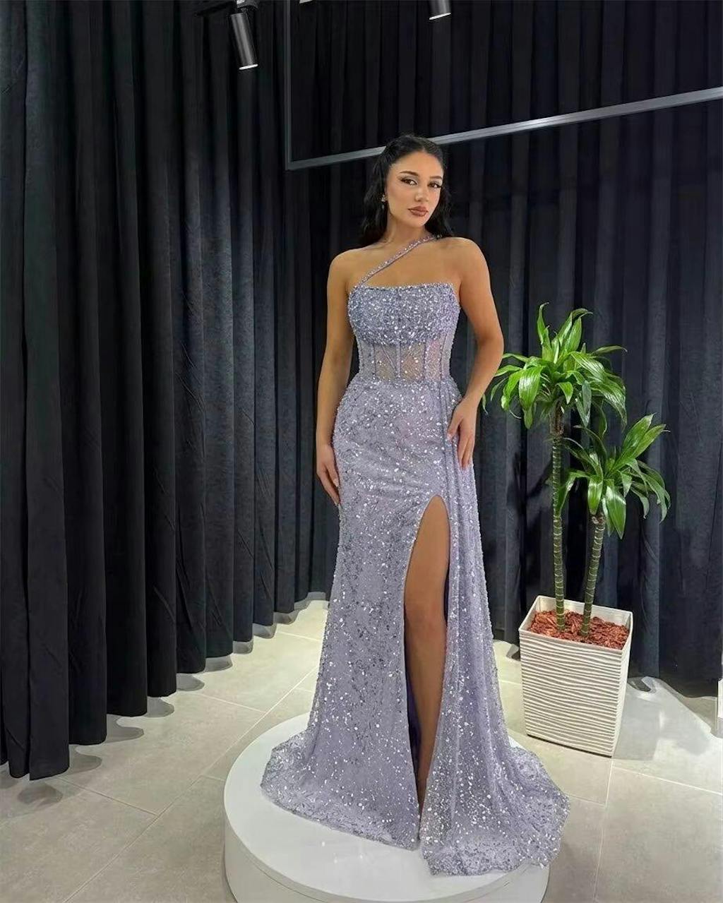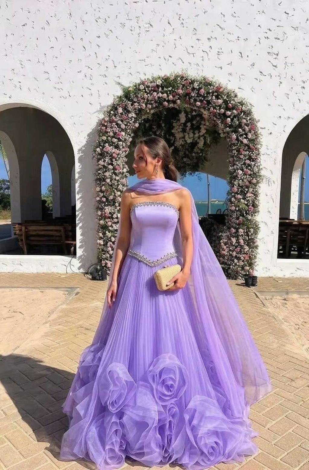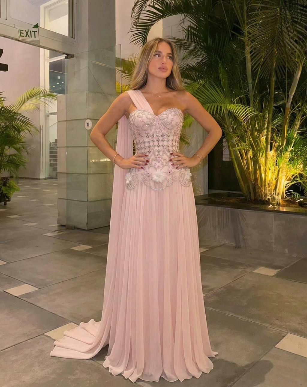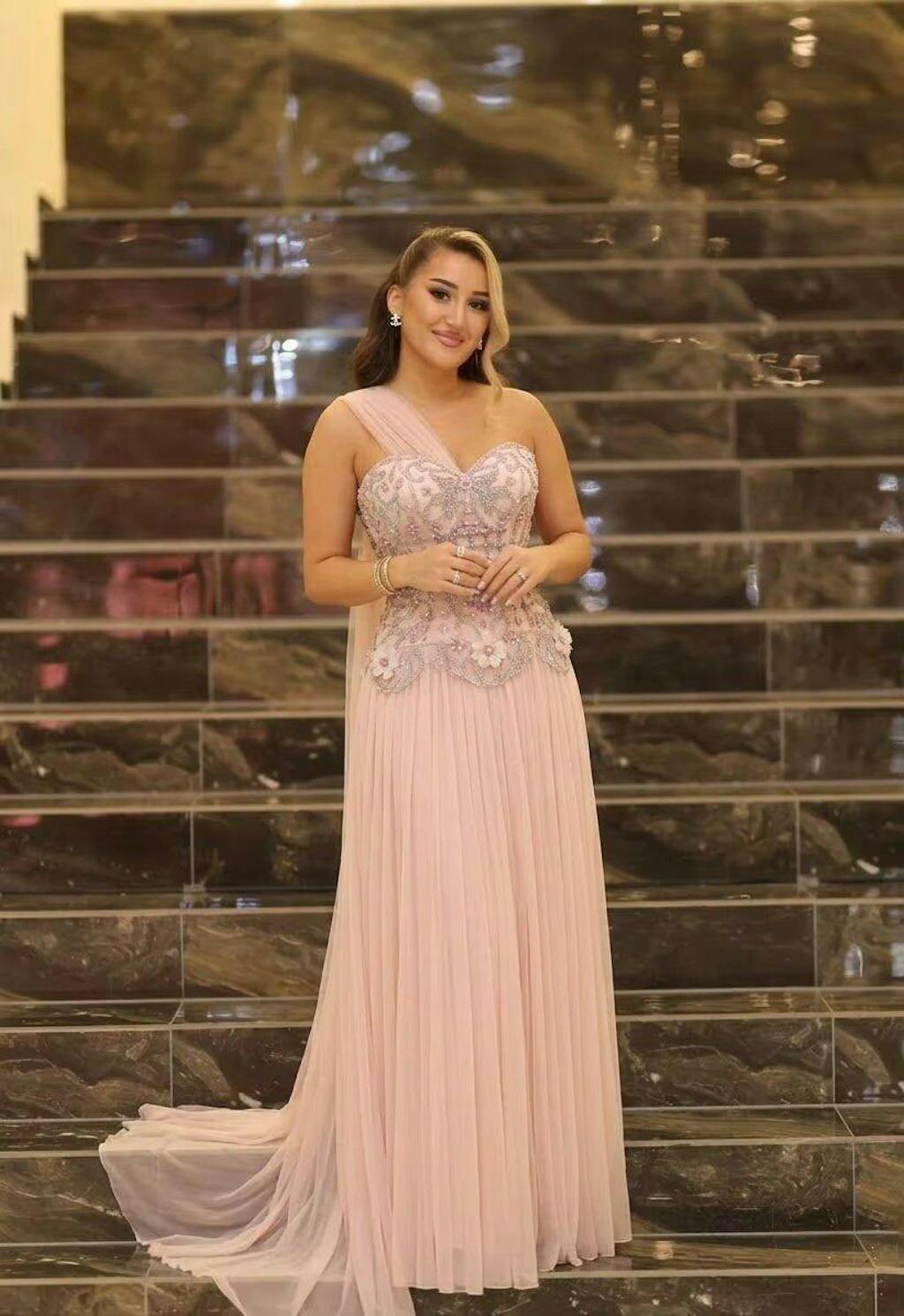 Blush pink dress looks dreamy, one-shoulder design is elegant, 3D floral details and beading are exquisite.