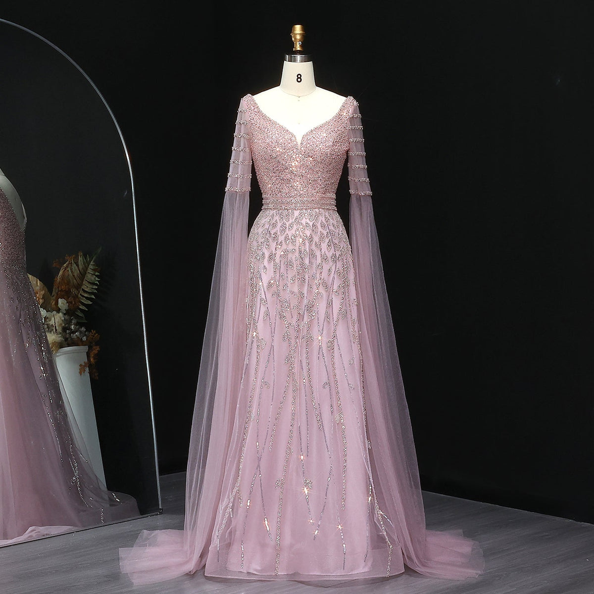 Expertly designed by Sharon Said, these luxury feathers and elegant evening dresses will make a stunning addition to any woman's wardrobe. Perfect for any special occasion, from Dubai to Turkey, these dusty pink gowns with a cape are sure to turn heads and make a statement of sophistication and style.