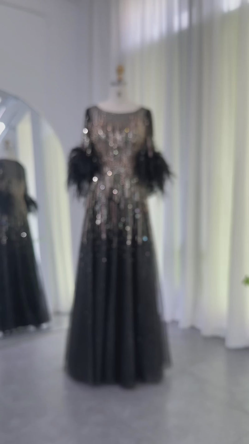Luxury Feathers Black Half Sleeve Evening Dress SS339