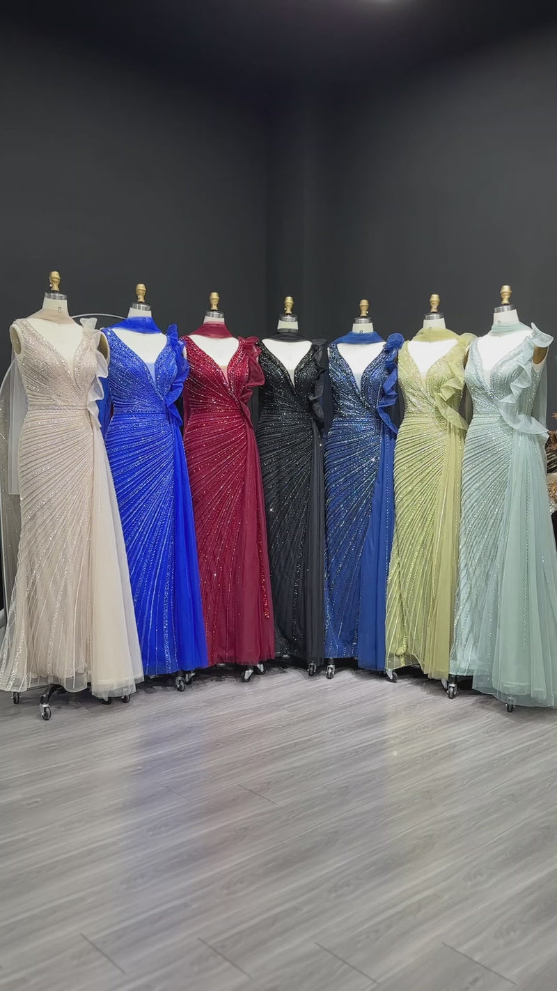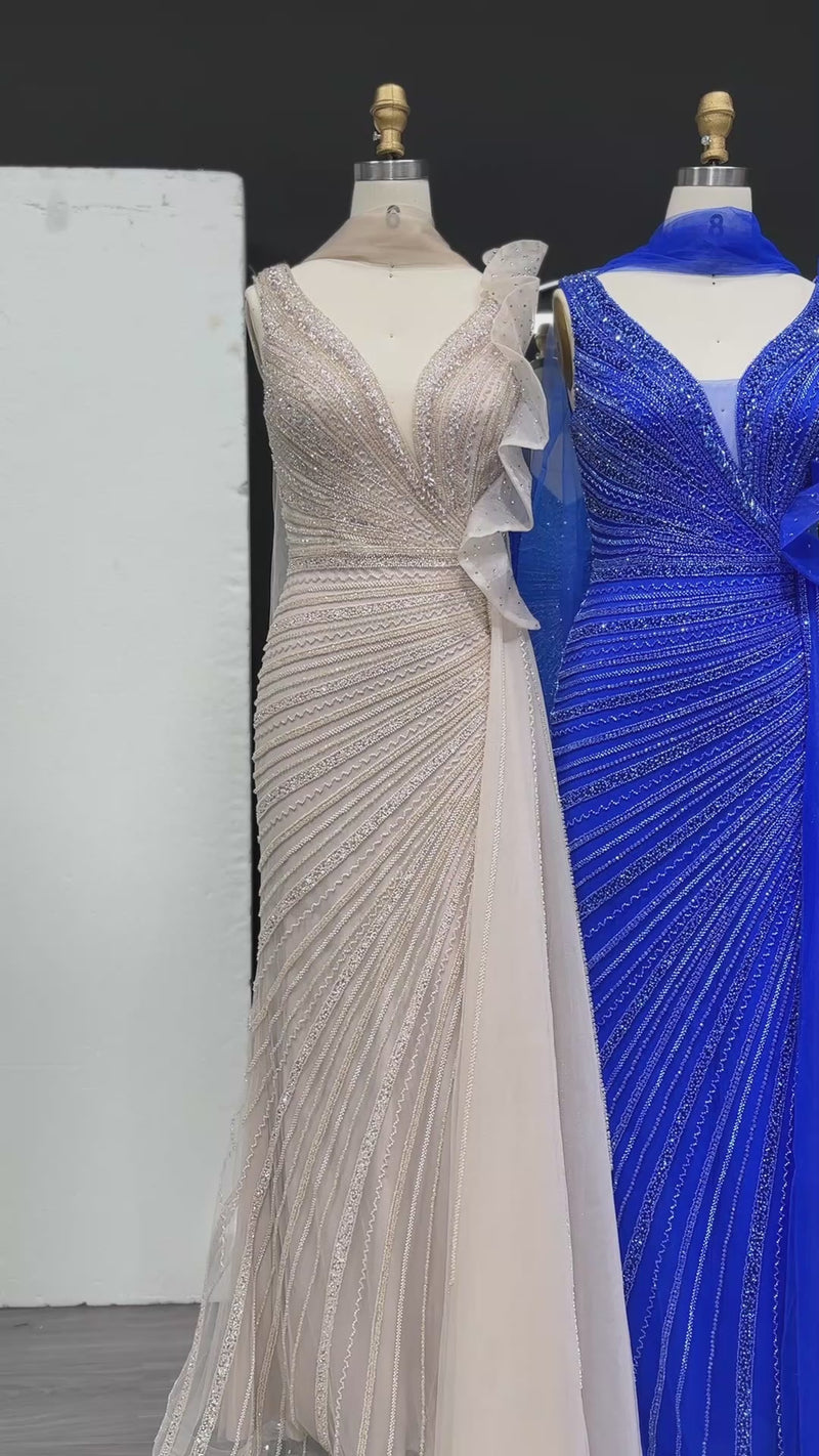 This luxury beaded mermaid evening dress offers a stunning silhouette that effortlessly contours the body, accentuating your natural curves. Detailed with exquisite beadwork, it features a matching scarf and an elegant overskirt that add depth and versatility to your look. Perfect for formal events, this dress combines sophisticated craftsmanship with graceful style for a truly memorable ensemble.