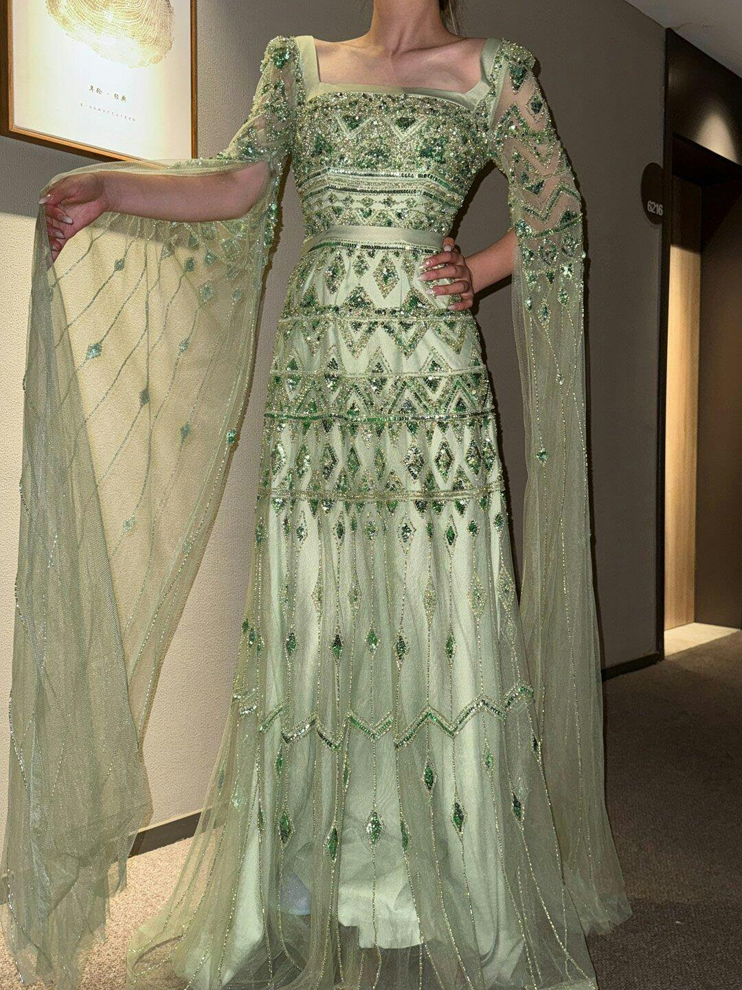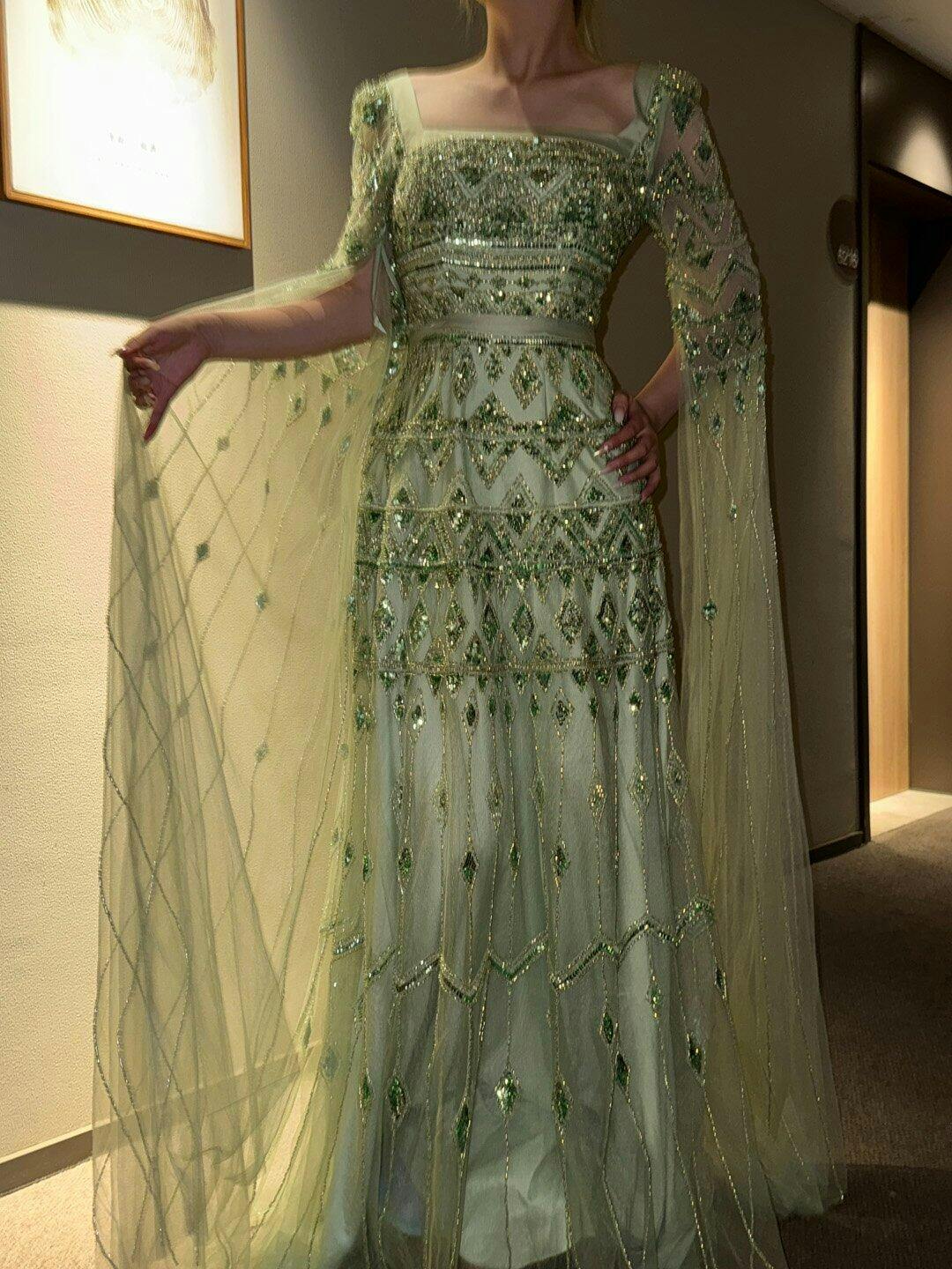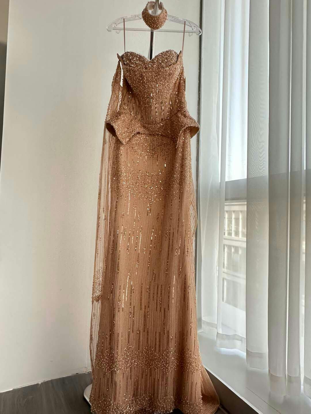 Such a beautiful and elegant gown. The beadwork is detailed but not heavy, and the cape sleeves add a soft, graceful look. Perfect for special occasions.