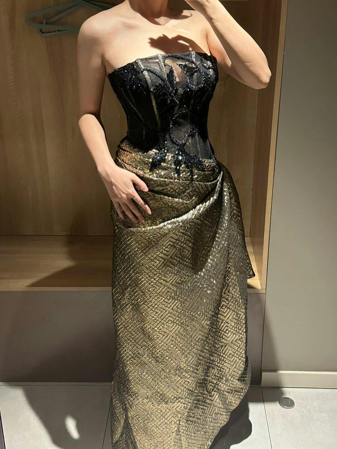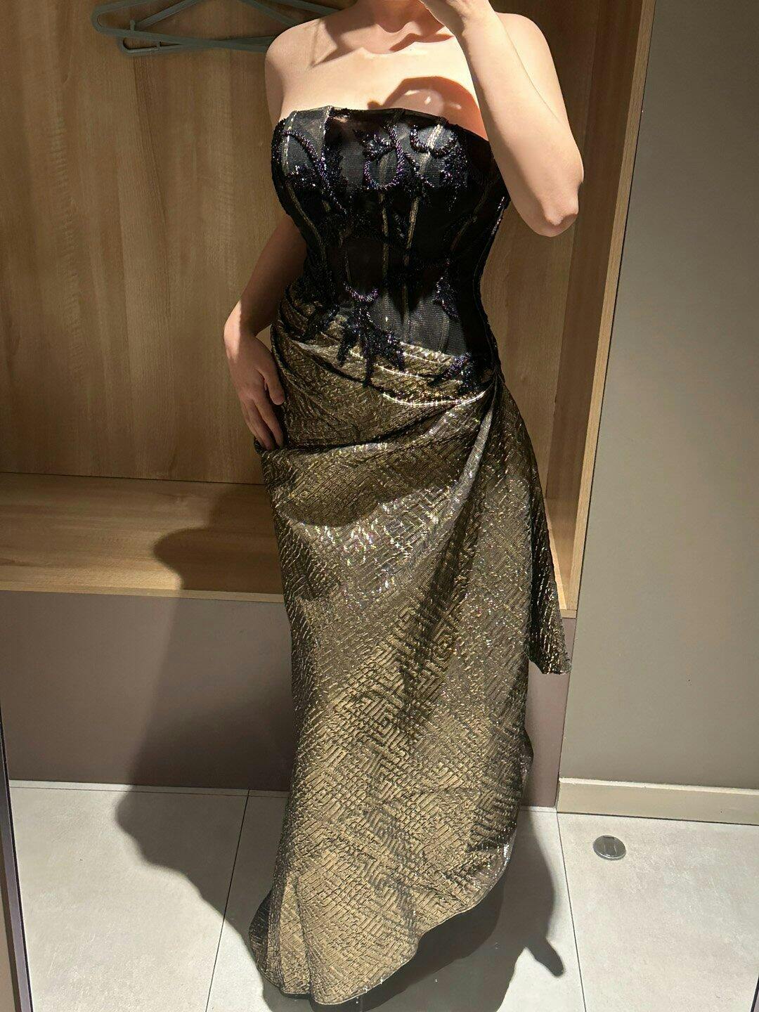 Wore this to a black-tie event, and I was the center of attention! The gold crystals sparkle beautifully, and the off-shoulder cut is just perfect. Elegant and timeless!