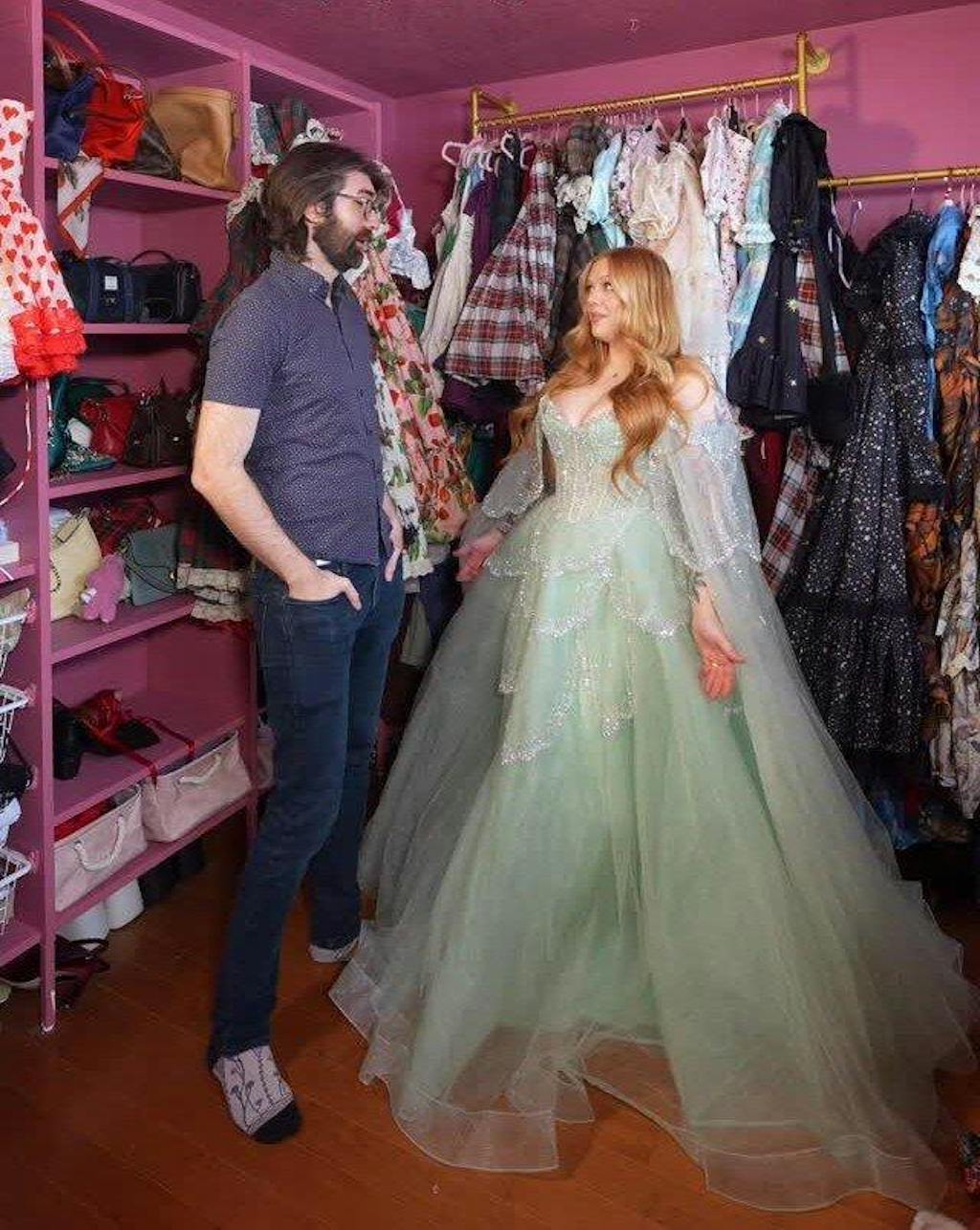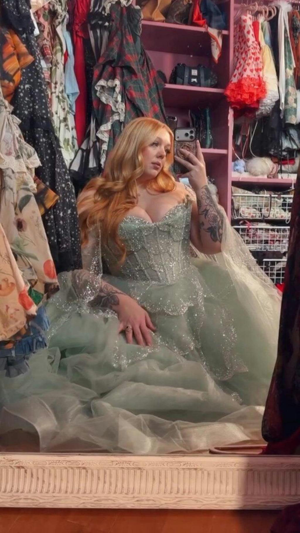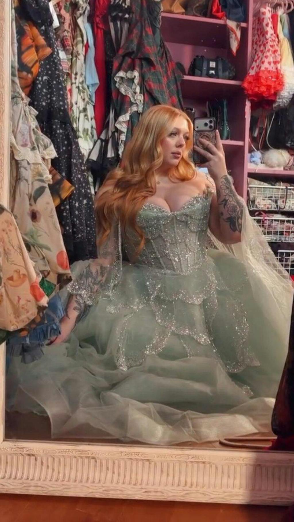 This purple green gown is absolutely breathtaking! The sequins shimmer beautifully under the lights and the cape train creates a dramatic, powerful look wherever I go.