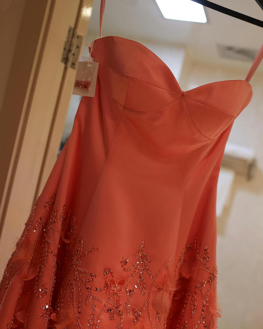 Experience luxury and elegance with the Sharon Said evening dress. Made with high-quality feathers, this coral pink dress features stunning 3D flowers and a sweetheart neckline. Perfect for weddings and formal parties, this dress will make you the center of attention. Available in long lengths for a graceful silhouette.