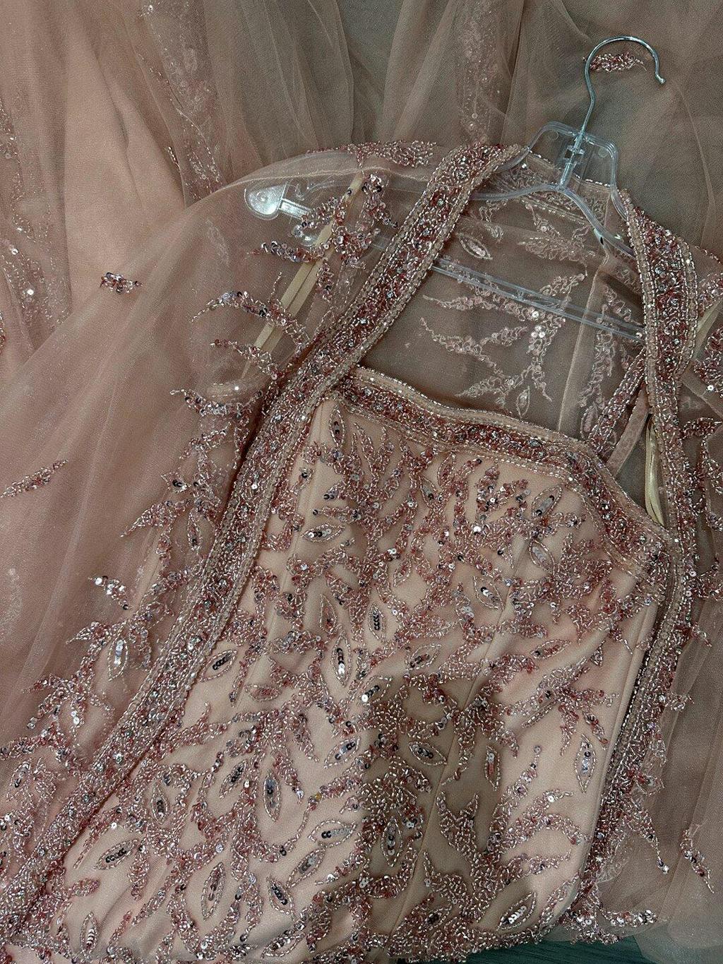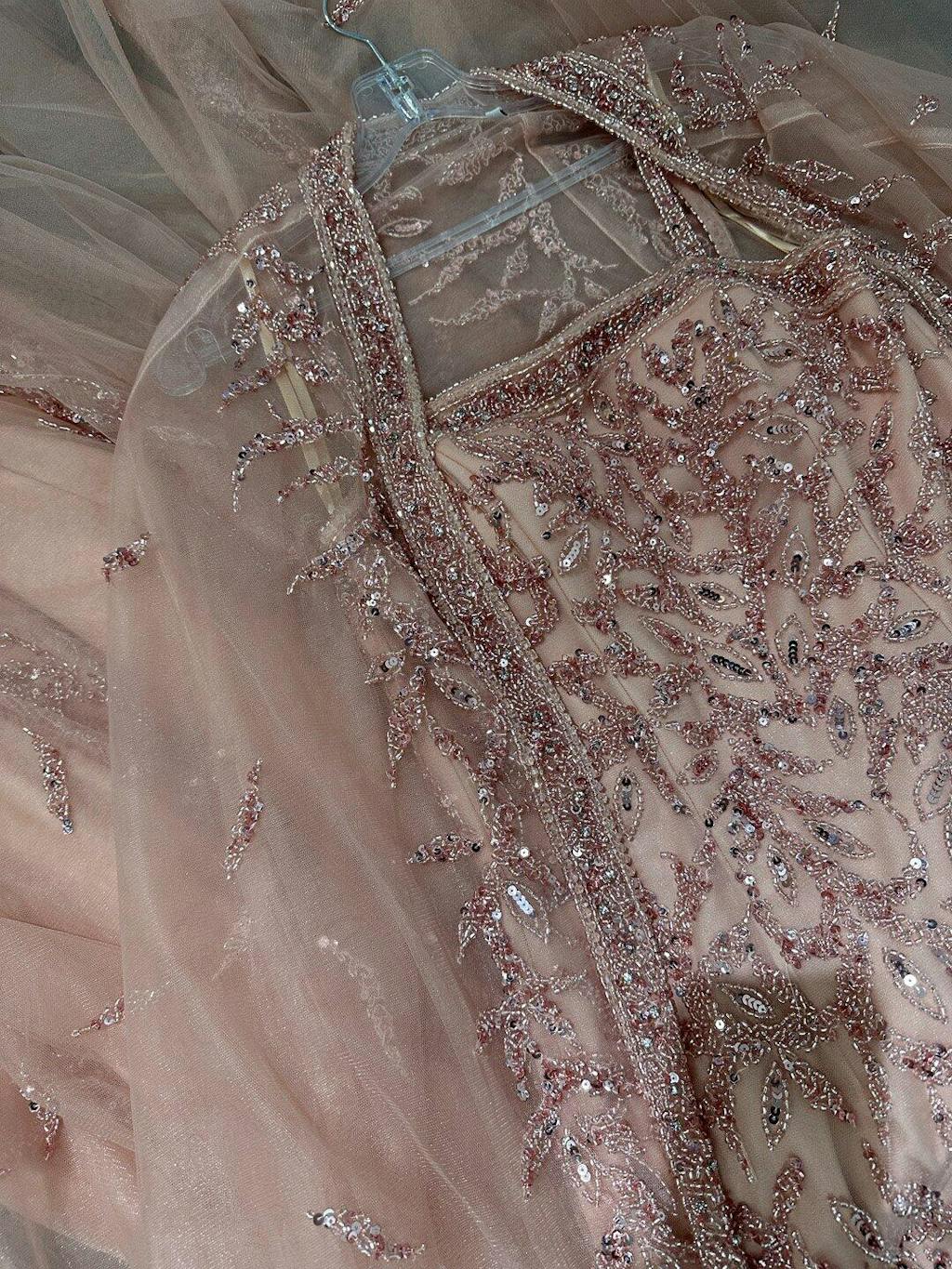 This elegant pink evening gown features intricate beadwork that adds a refined shimmer, perfectly complemented by a delicate sheer cape for a graceful silhouette. Designed to enhance your presence at any formal event, its sophisticated style offers both timeless beauty and modern flair.