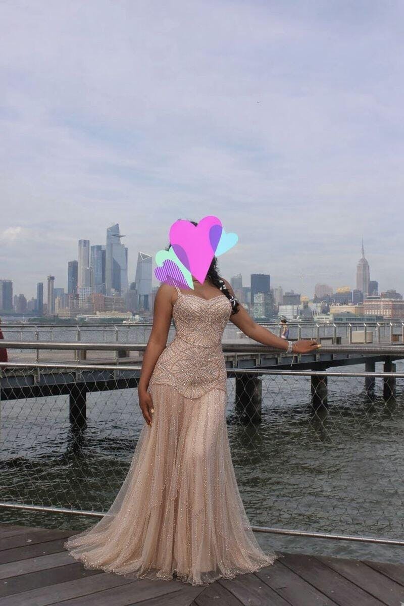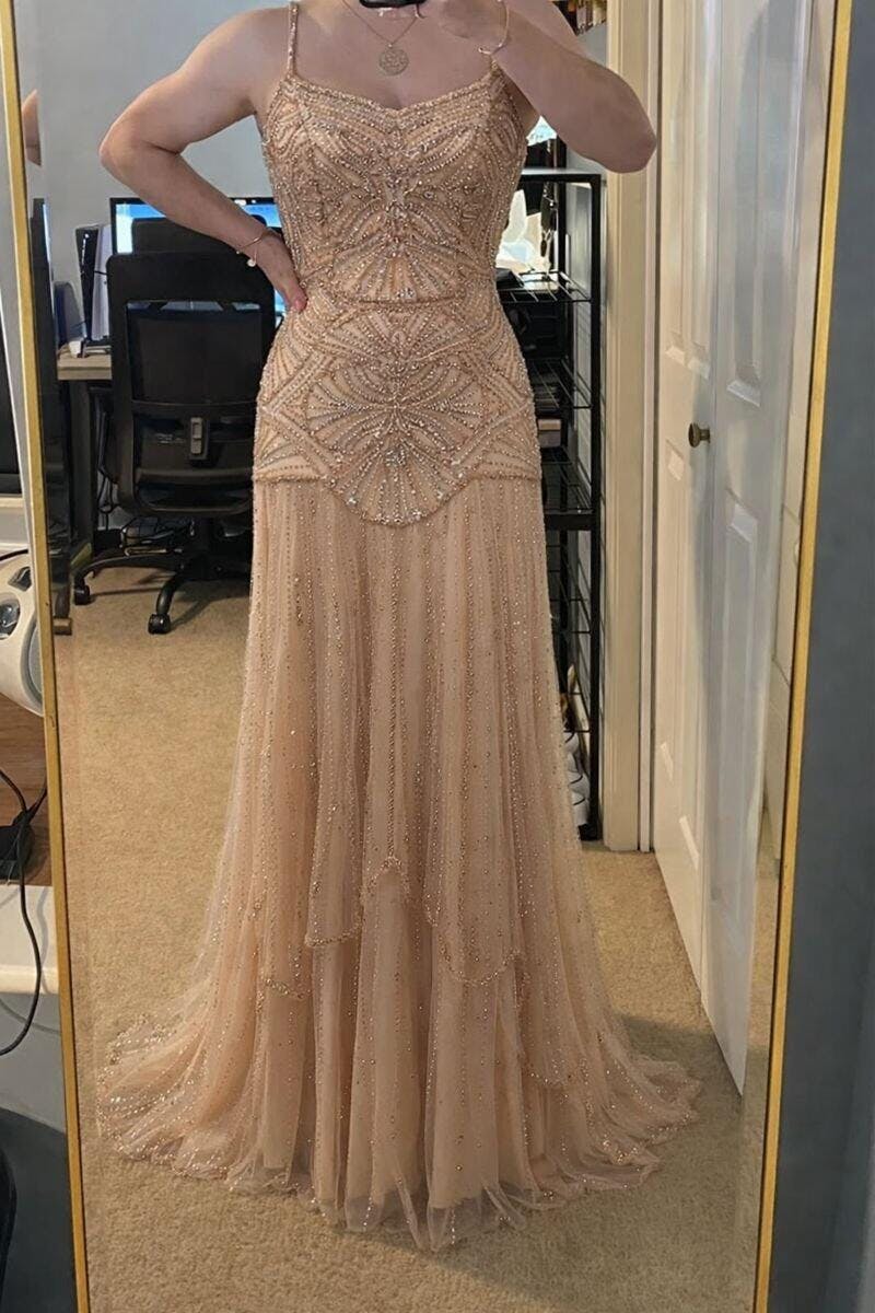 The champagne color is gorgeous and photographs beautifully. The craftsmanship is amazing for the price — looks like a designer gown. Shipping was much faster than expected. Highly recommend!
