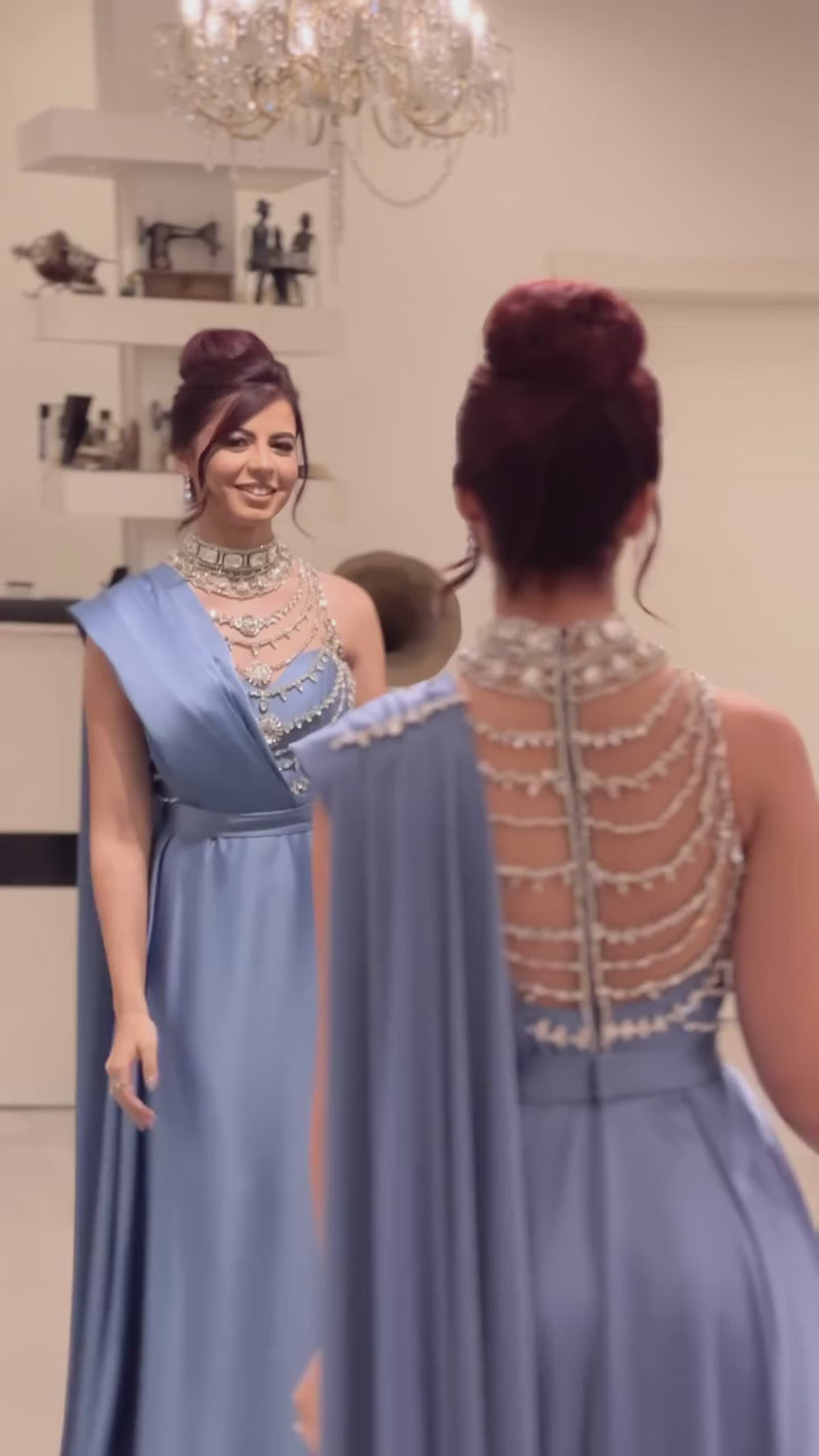 Indulge in luxury with our Elegant Blue Luxury Crystal Evening Gowns with Cape SS300. The crystal embellishments add a touch of glamorous elegance to the stunning blue gown. With the addition of a cape, you'll feel like royalty as you make an entrance at any special event. Elevate your style to the next level.