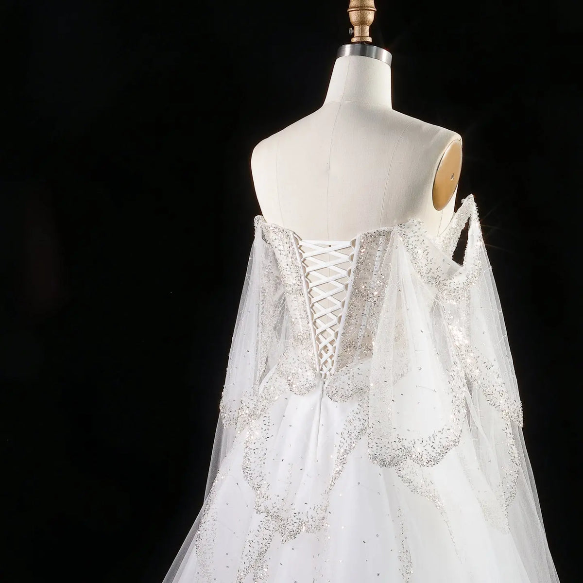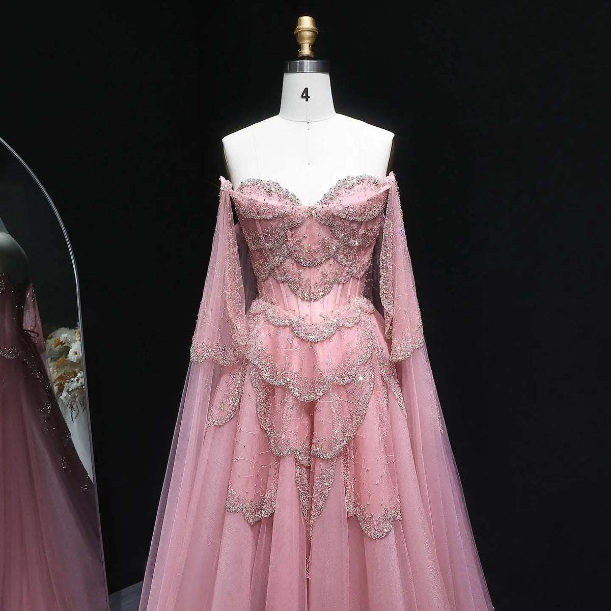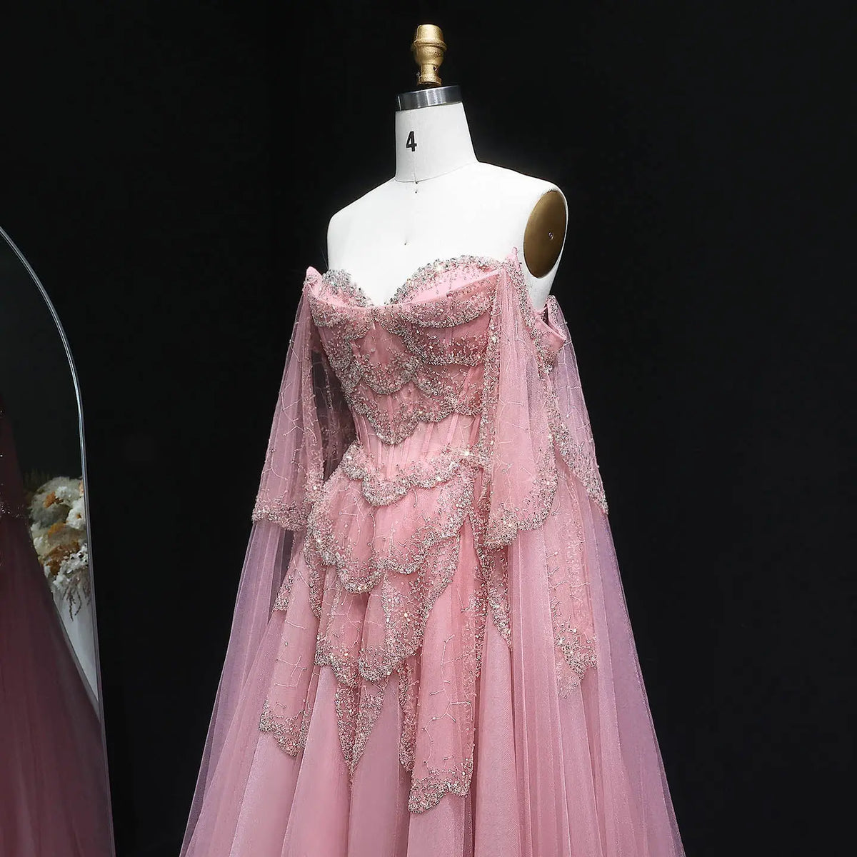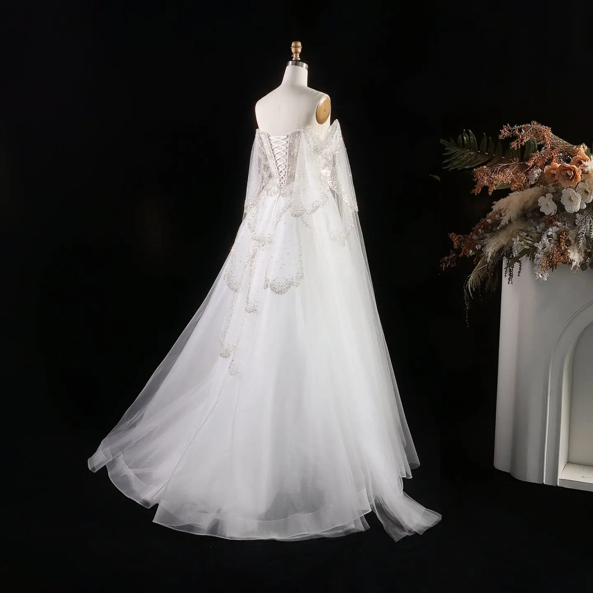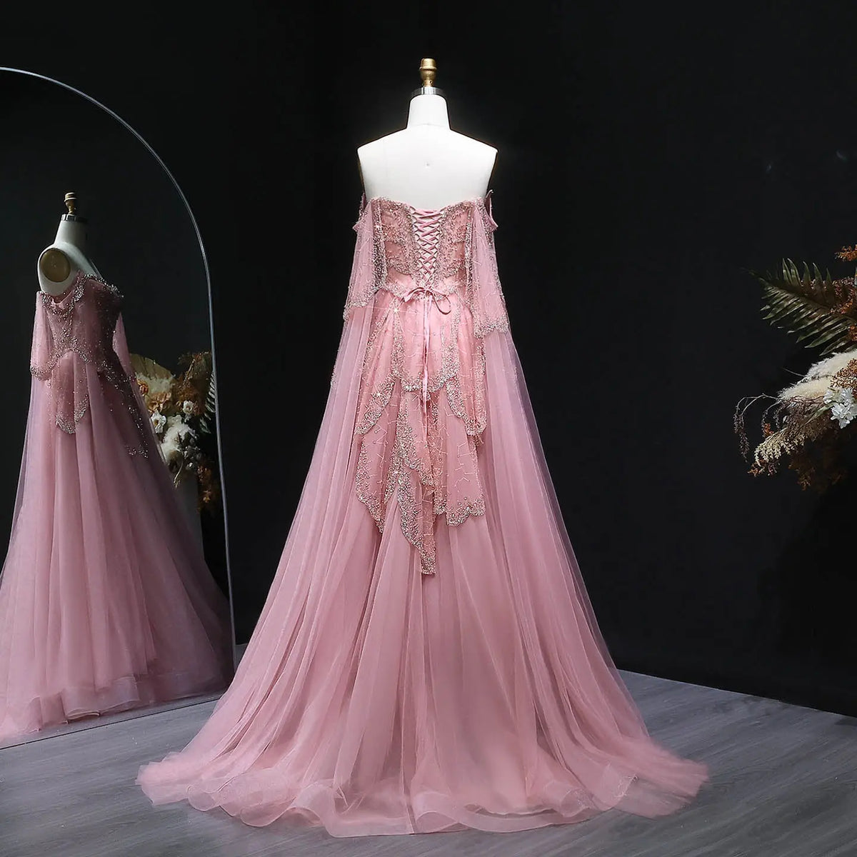 A whimsical fantasy ball gown inspired by Bridgerton elegance and Met Gala drama. Featuring an off shoulder neckline and flowing cape sleeves, this dress exudes sophistication and elegance. Perfect for any evening event, it will turn heads and make you feel like a true star.