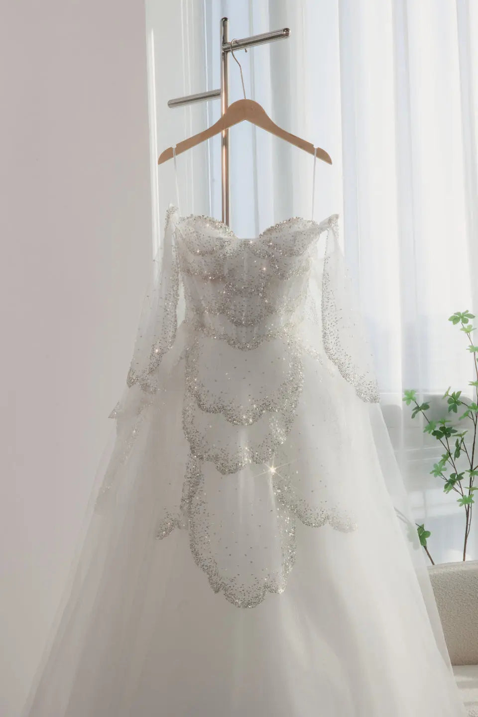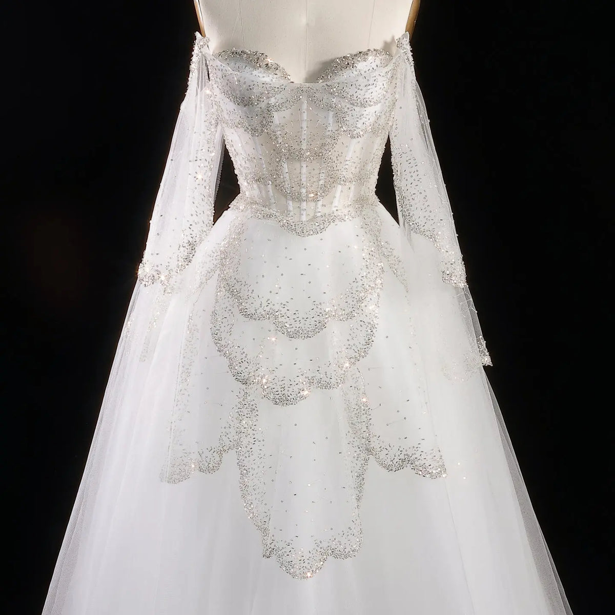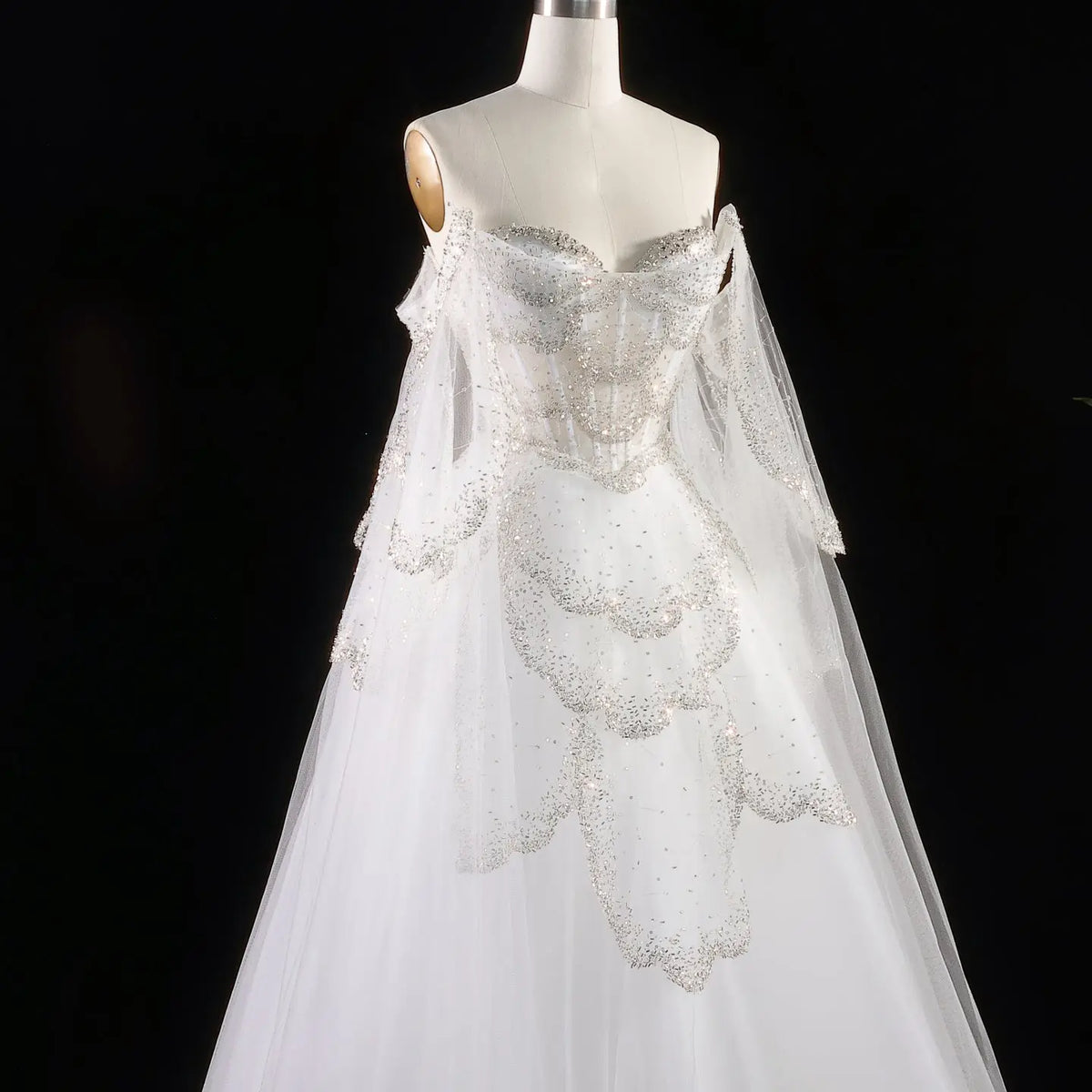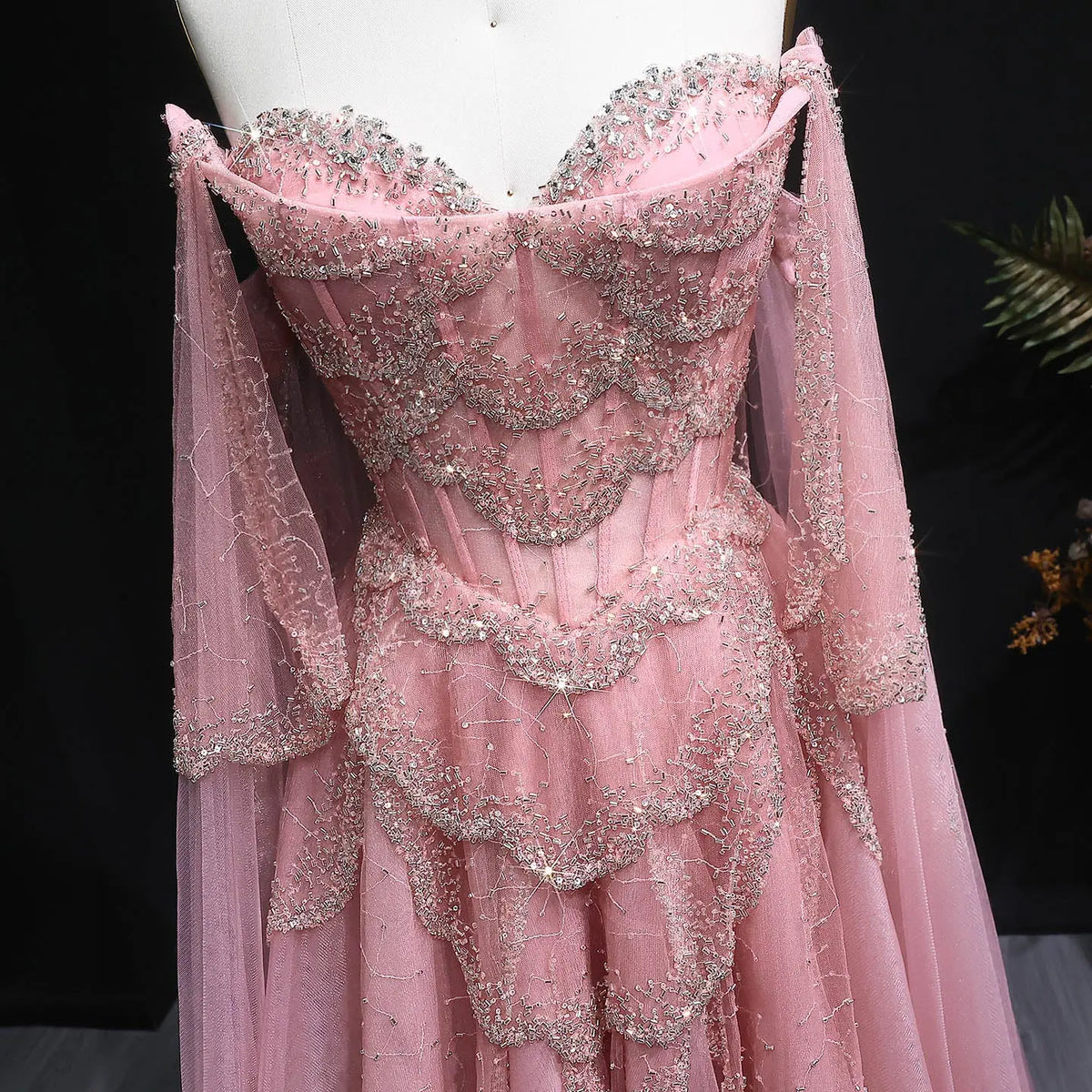 A whimsical fantasy ball gown inspired by Bridgerton elegance and Met Gala drama. Featuring an off shoulder neckline and flowing cape sleeves, this dress exudes sophistication and elegance. Perfect for any evening event, it will turn heads and make you feel like a true star.