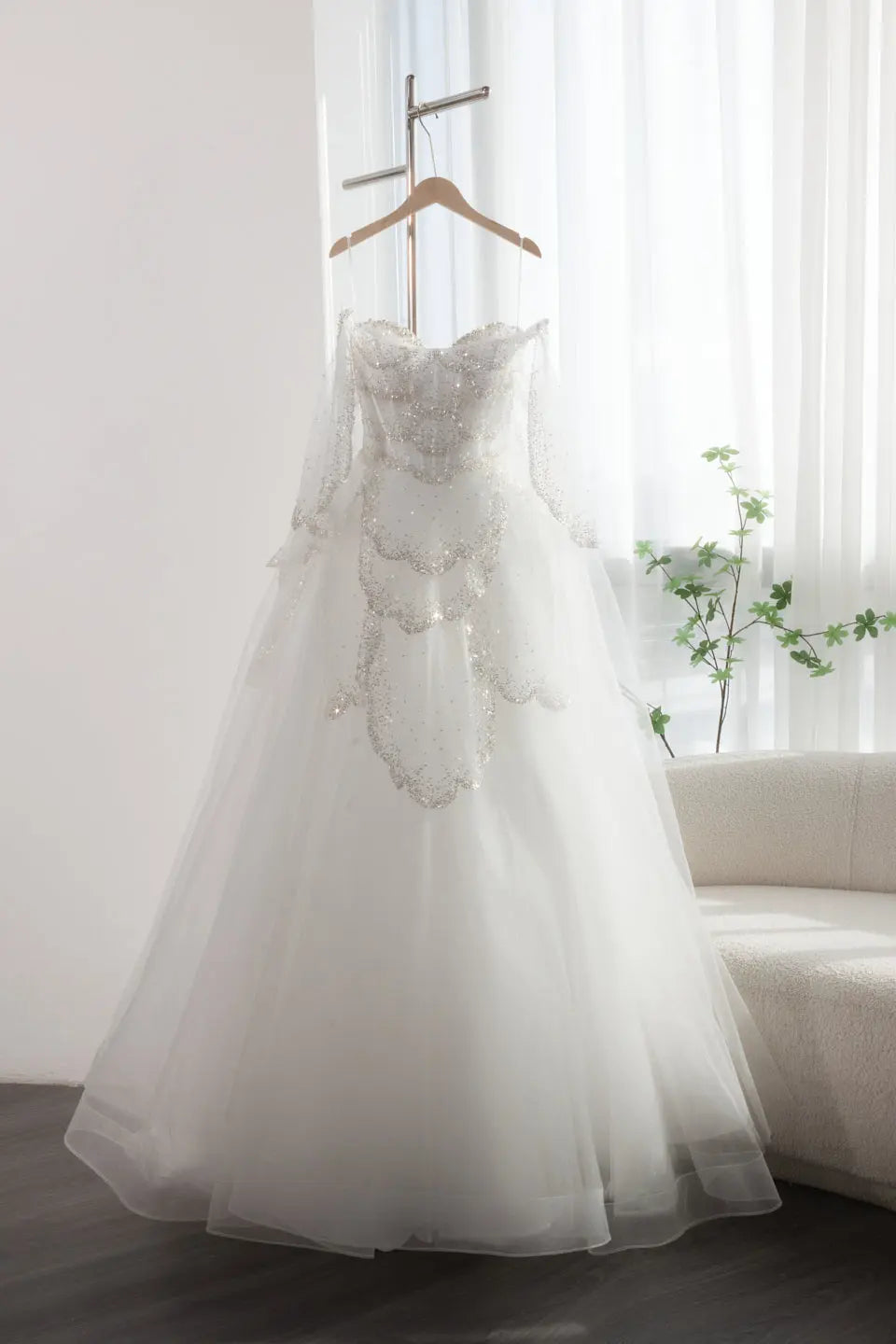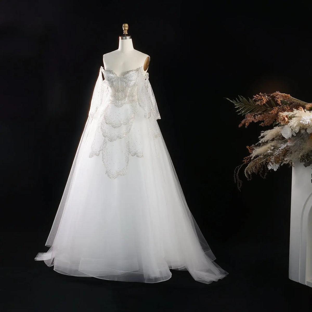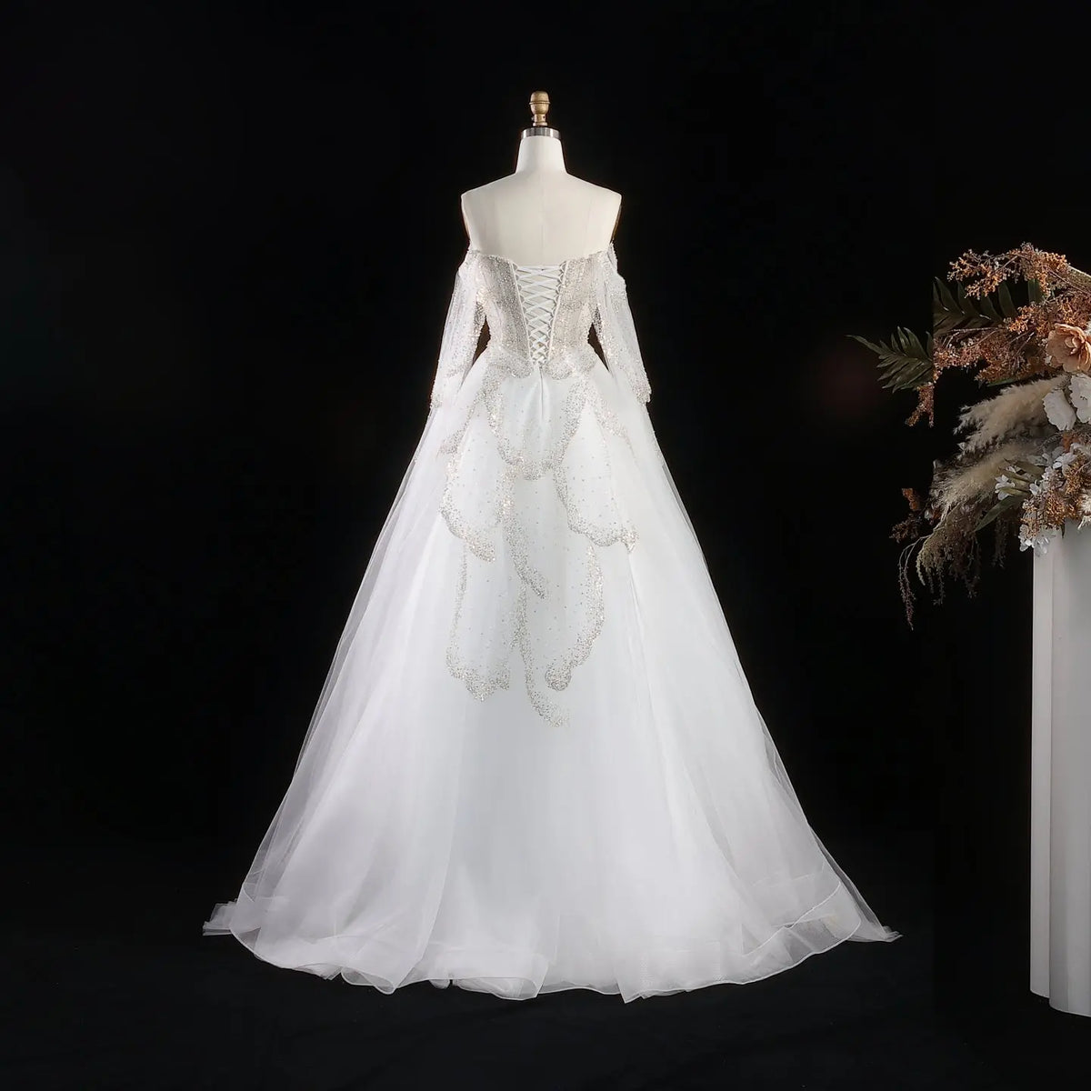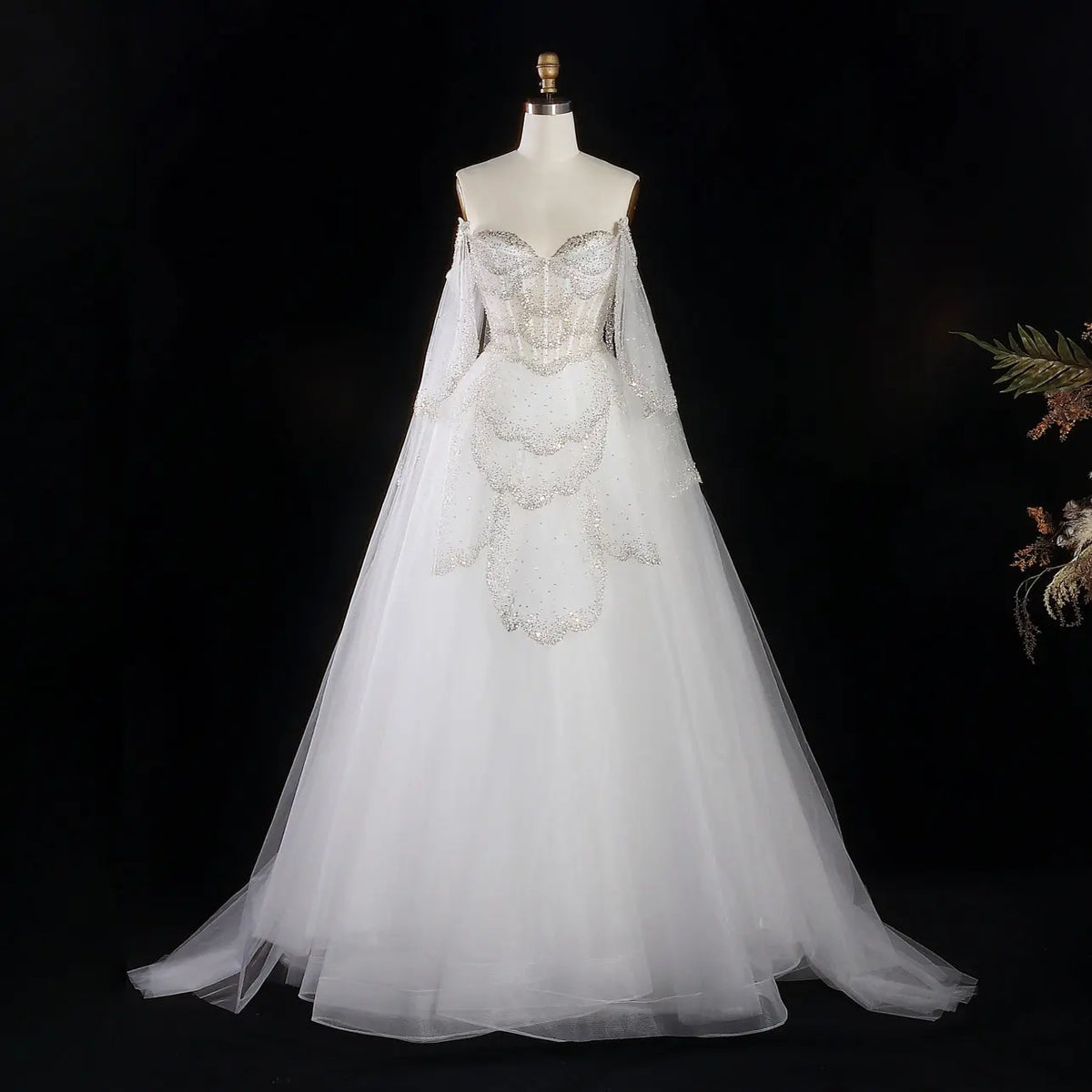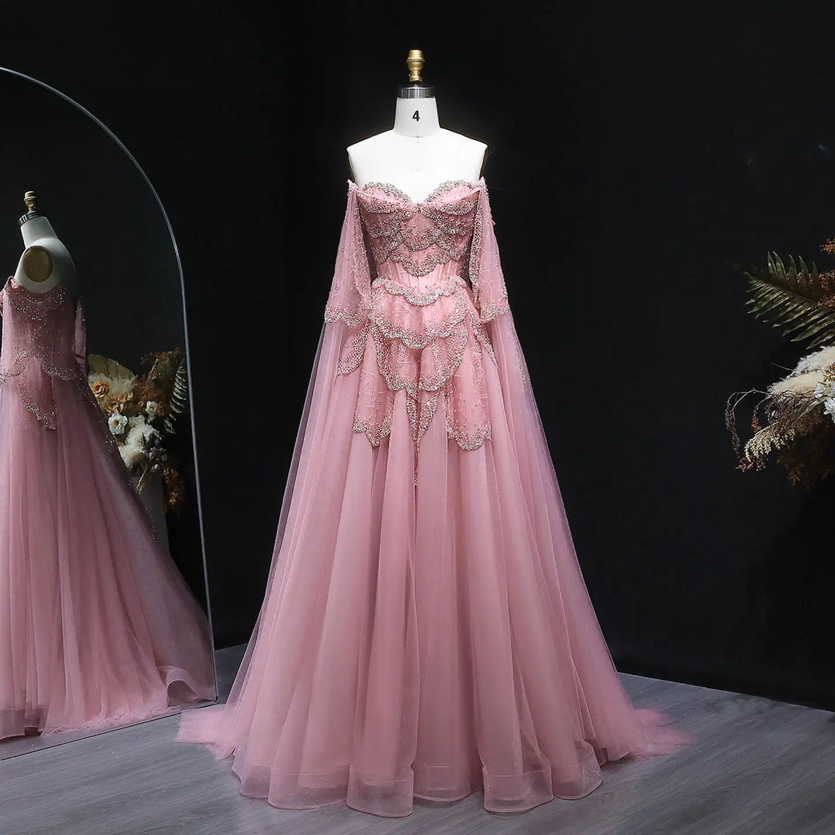 A whimsical fantasy ball gown inspired by Bridgerton elegance and Met Gala drama. Featuring an off shoulder neckline and flowing cape sleeves, this dress exudes sophistication and elegance. Perfect for any evening event, it will turn heads and make you feel like a true star.