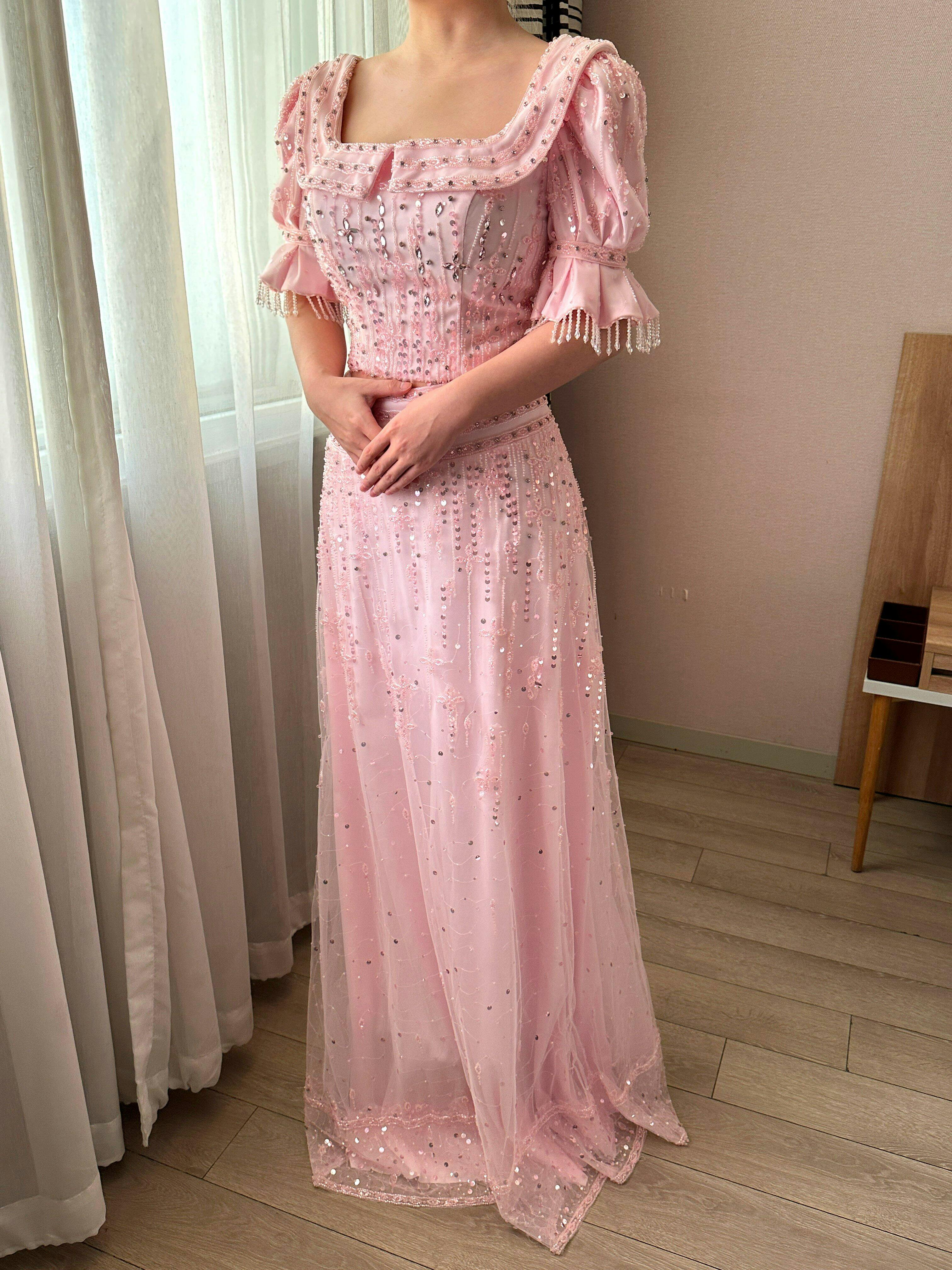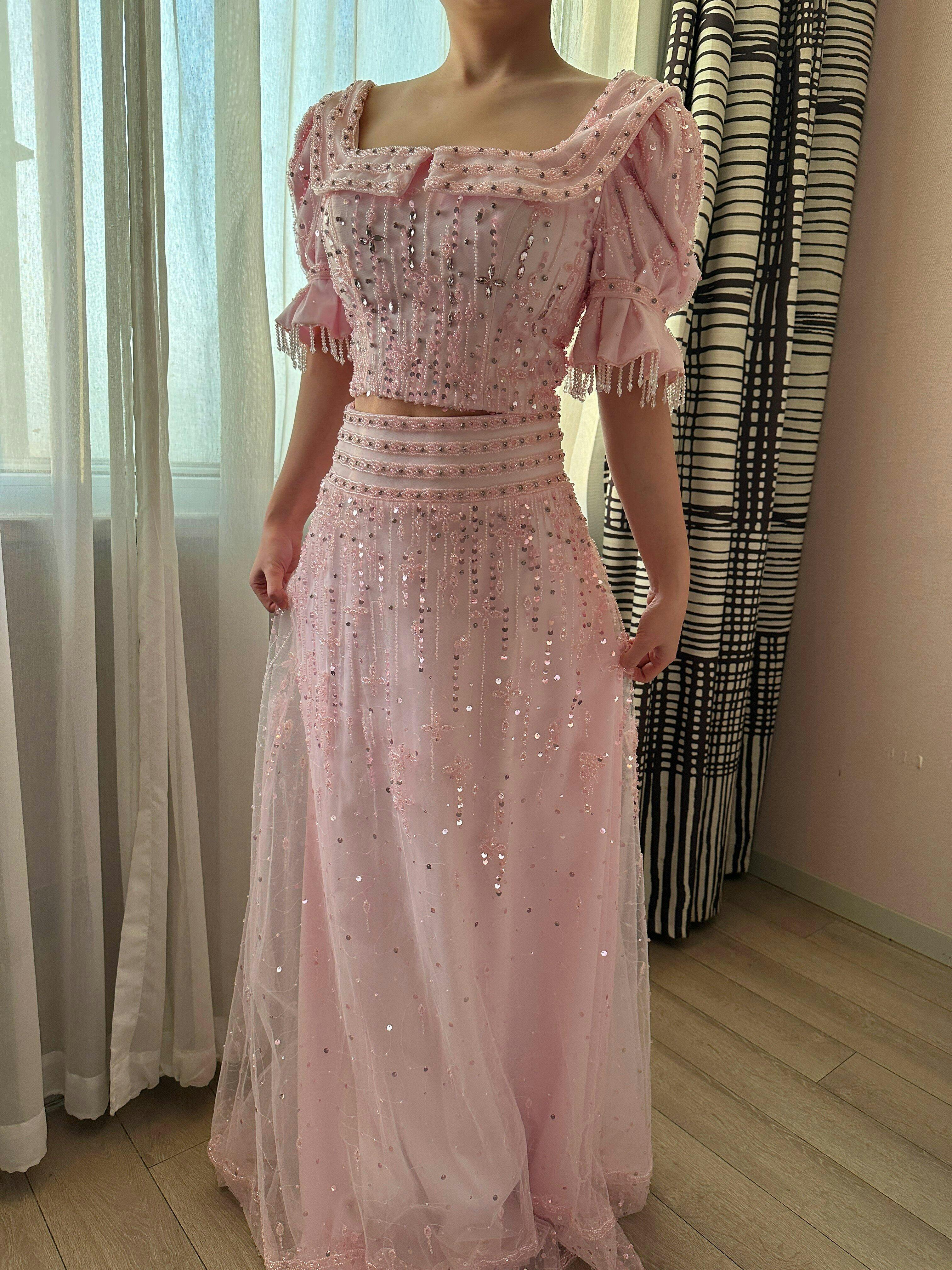 Elegant Sequin Pink Puff Sleeve Two-Piece Evening Dress SS548