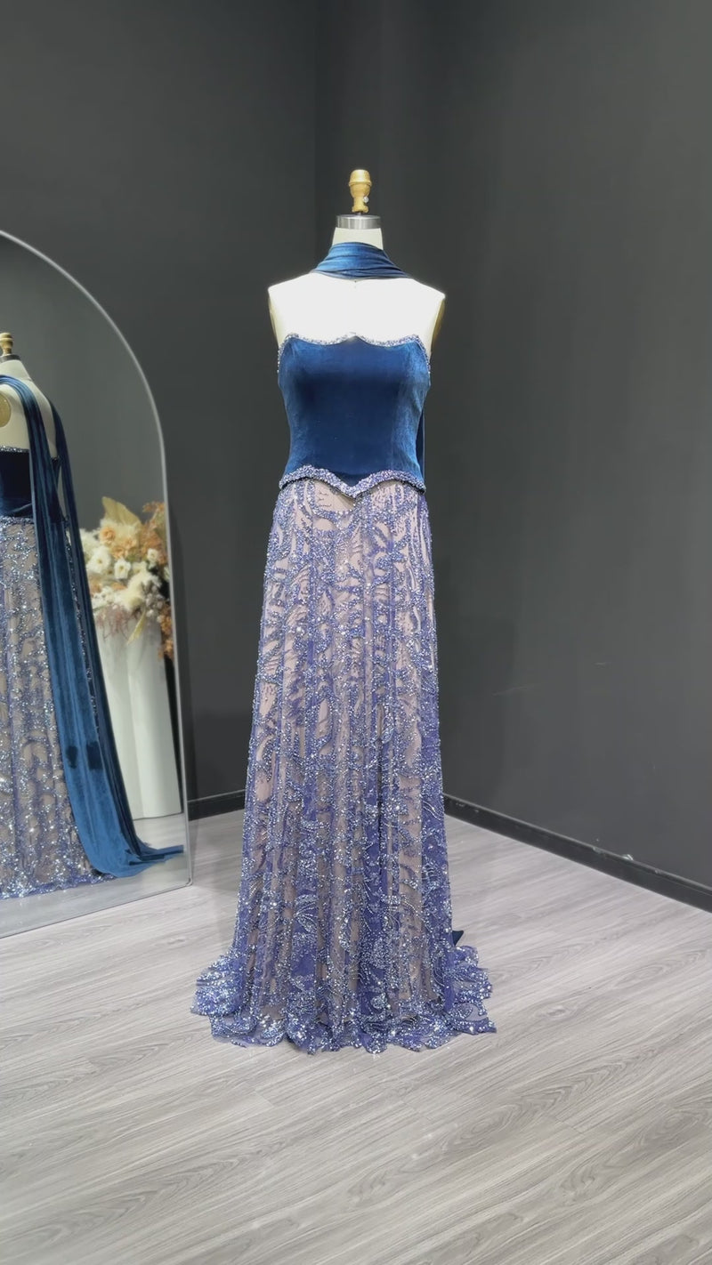Luxury Beaded Blue Velvet Evening Dress with Scarf SS793