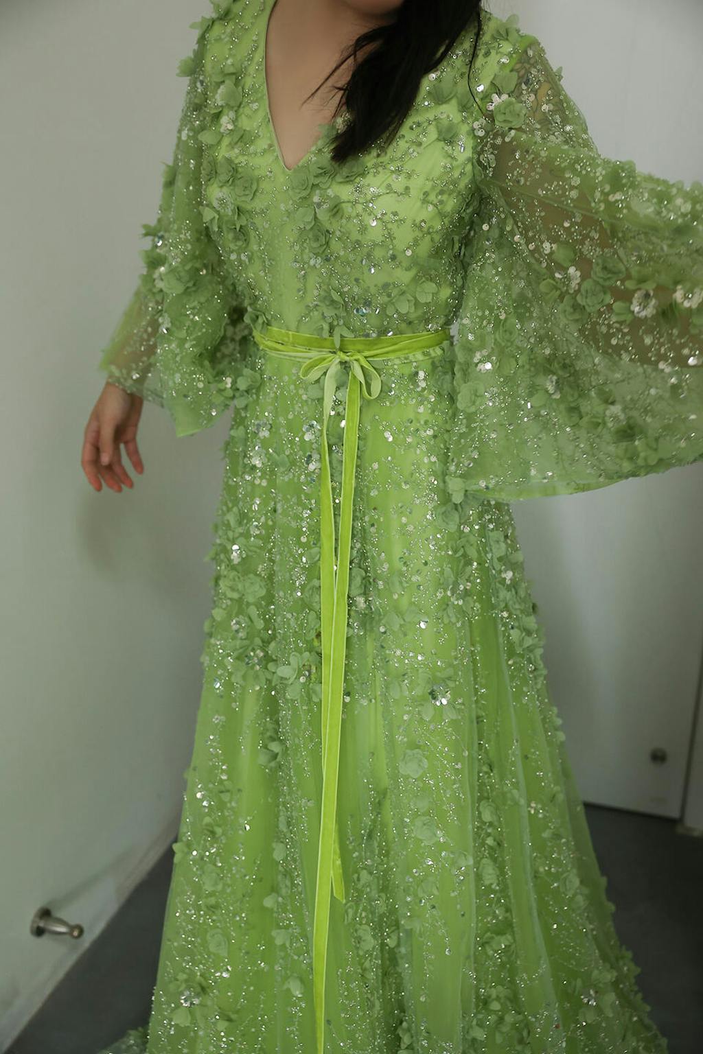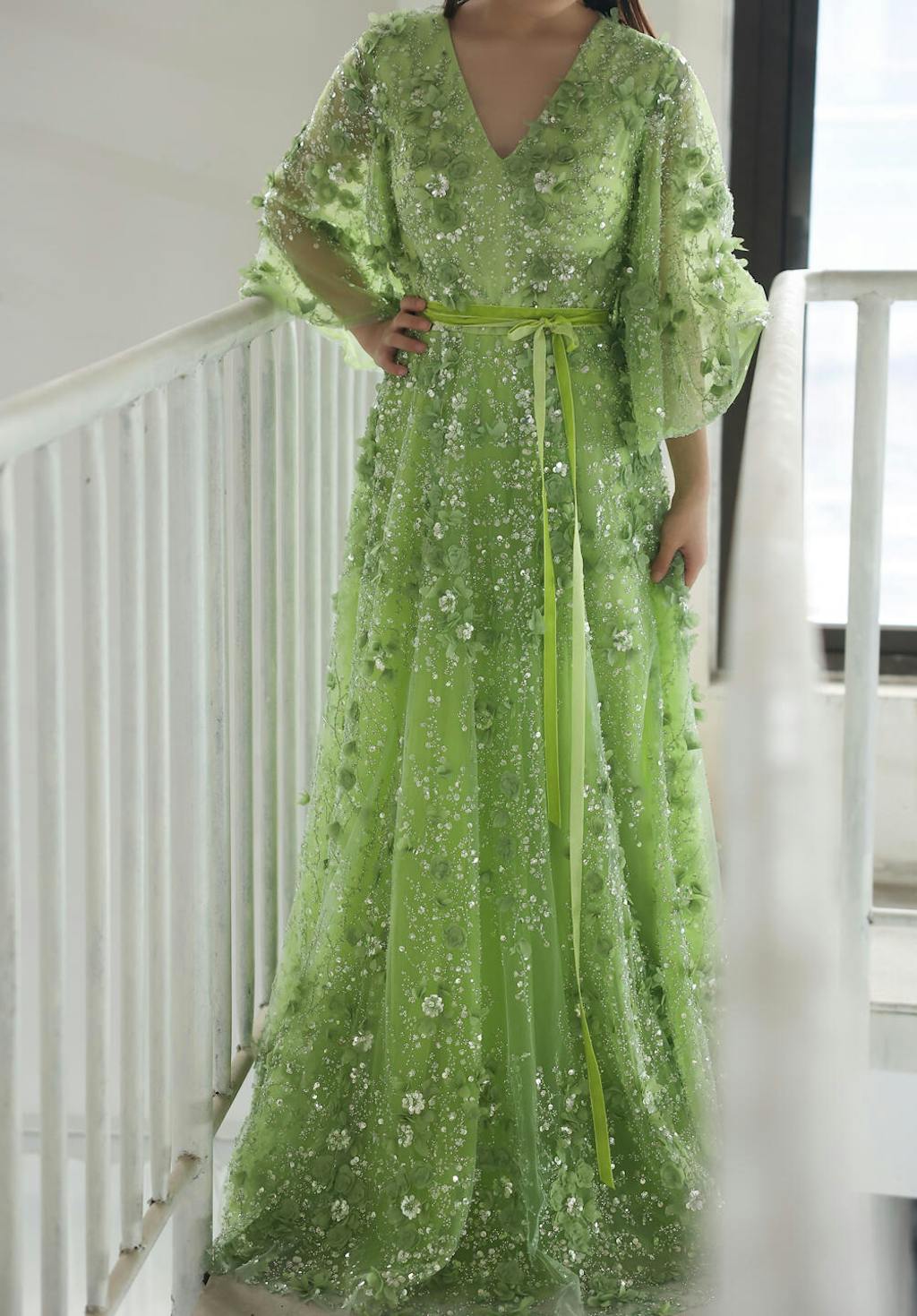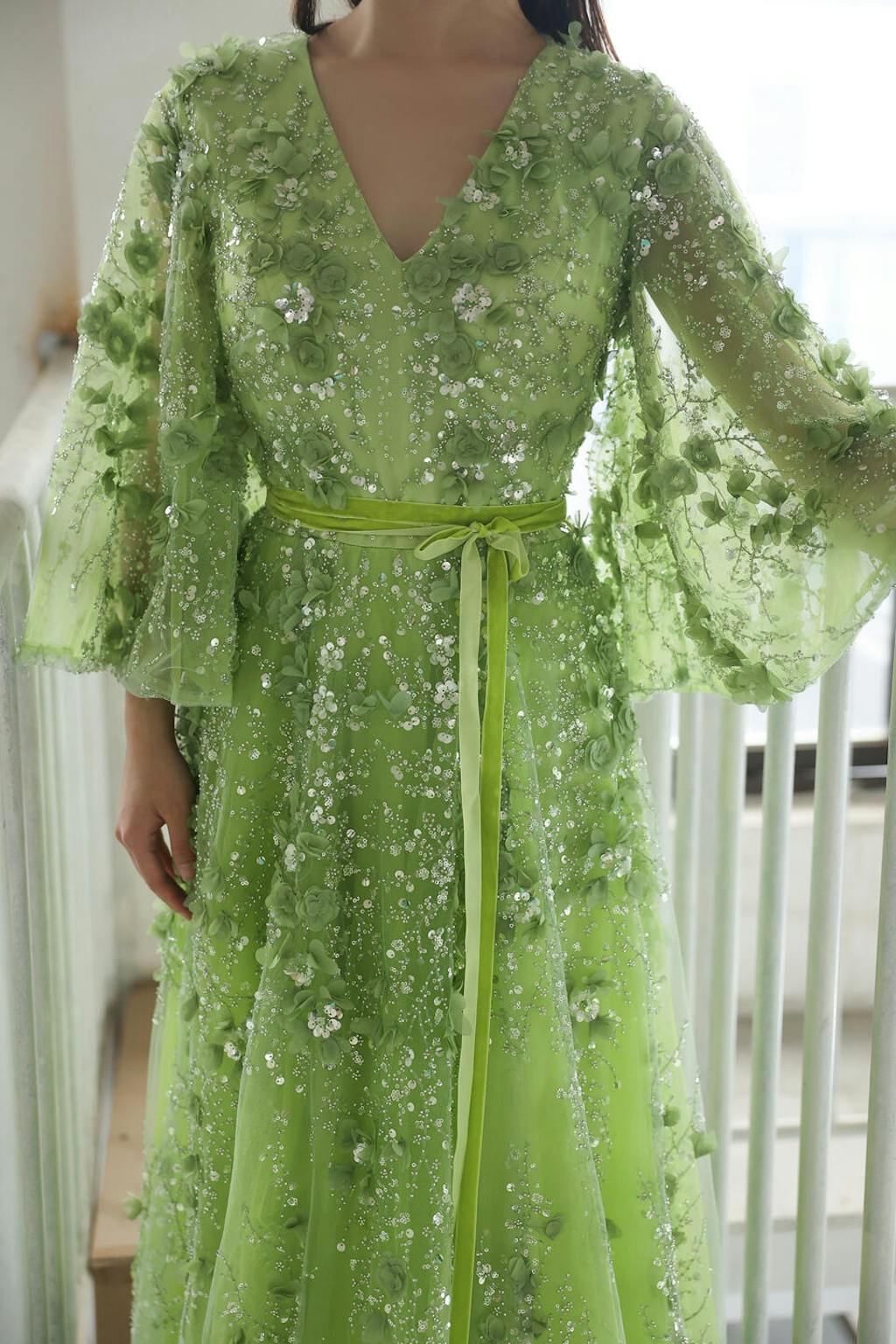 Sexy V-neck Green 3D Embroidered Flowers Evening Dress SS354