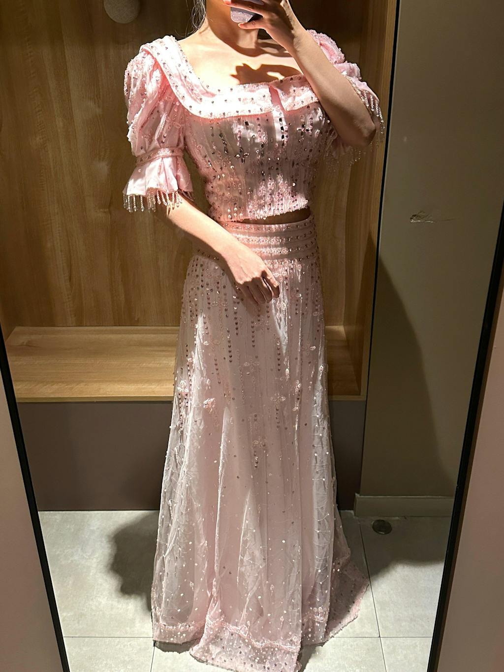 Elegant Sequin Pink Puff Sleeve Two-Piece Evening Dress SS548