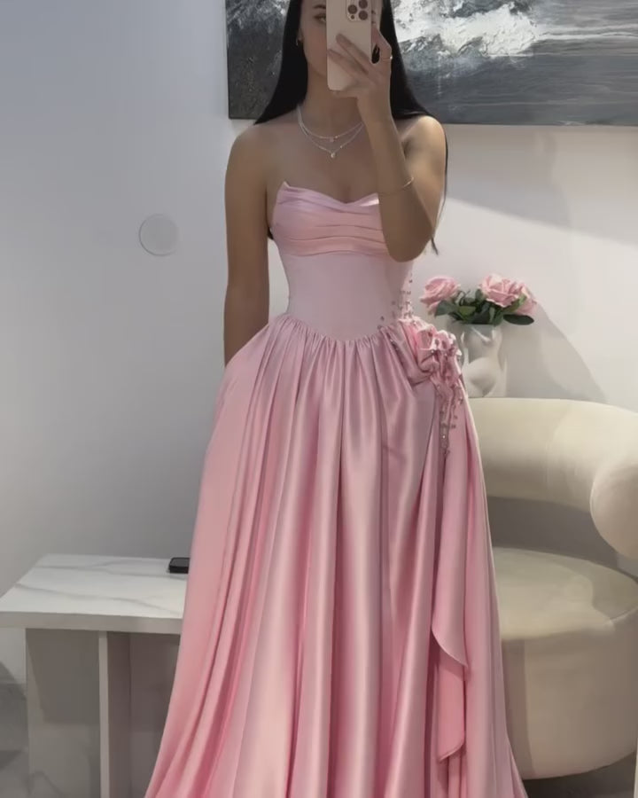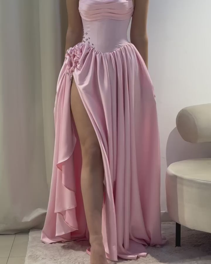Exude timeless elegance in this stunning pink evening dress, designed to captivate at any formal occasion. The strapless neckline offers a refined silhouette, while delicate crystal embellishments add a touch of glamour and sophistication. Dramatic ruffled detailing creates movement and dimension, perfectly complemented by the high slit that provides both allure and ease of movement. Crafted for the modern woman who appreciates understated luxury, this gown transforms you into the focal point of any event. An investment piece that transcends seasons and trends.
