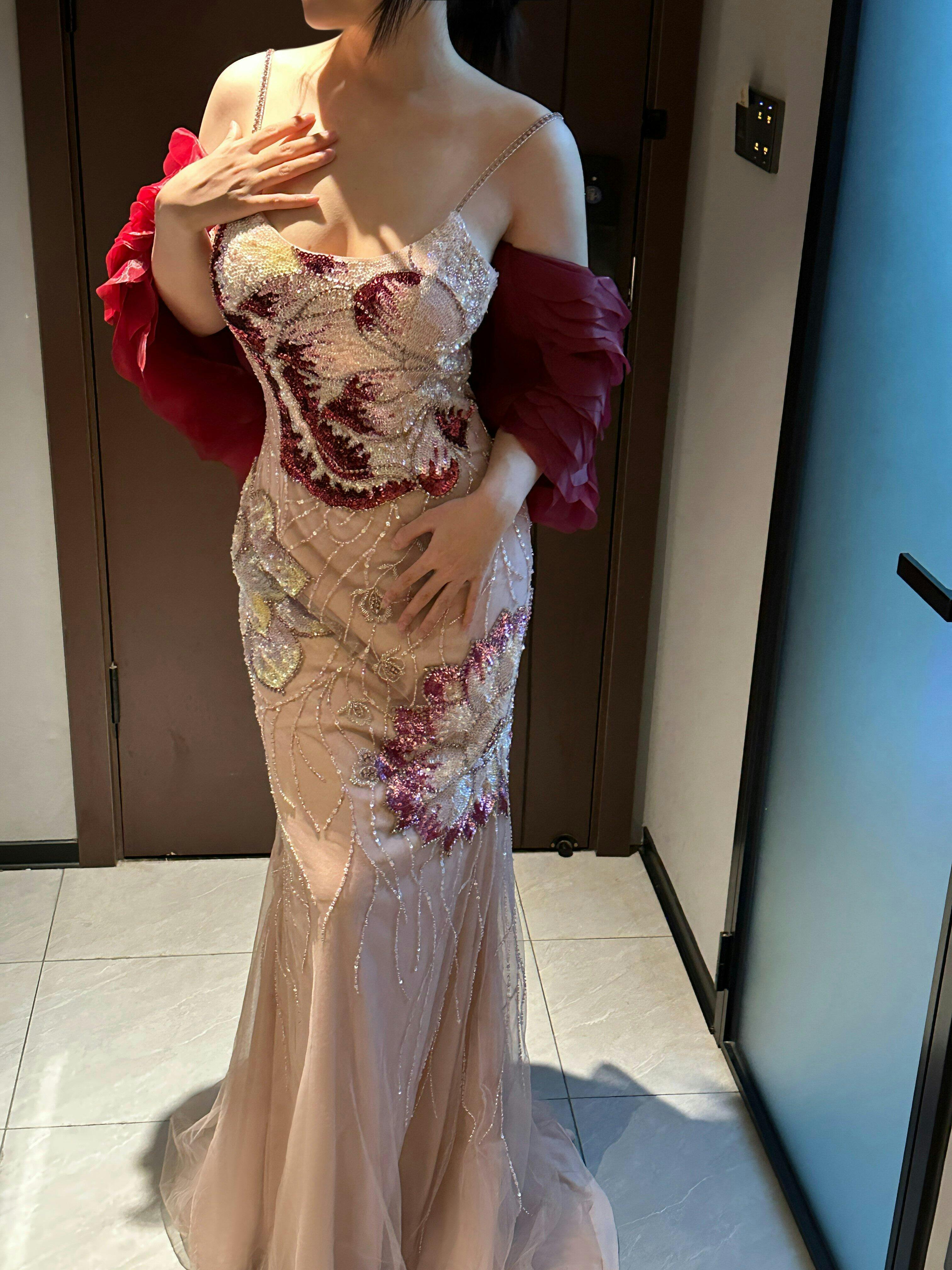 Elevate your evening elegance with this Luxury Pink Floral Beaded Dress, featuring delicate spaghetti straps and intricate beadwork that captures light beautifully. Paired with a rich burgundy shawl cape, it offers a refined contrast and graceful coverage. Perfect for sophisticated parties, this ensemble blends feminine charm with timeless style.