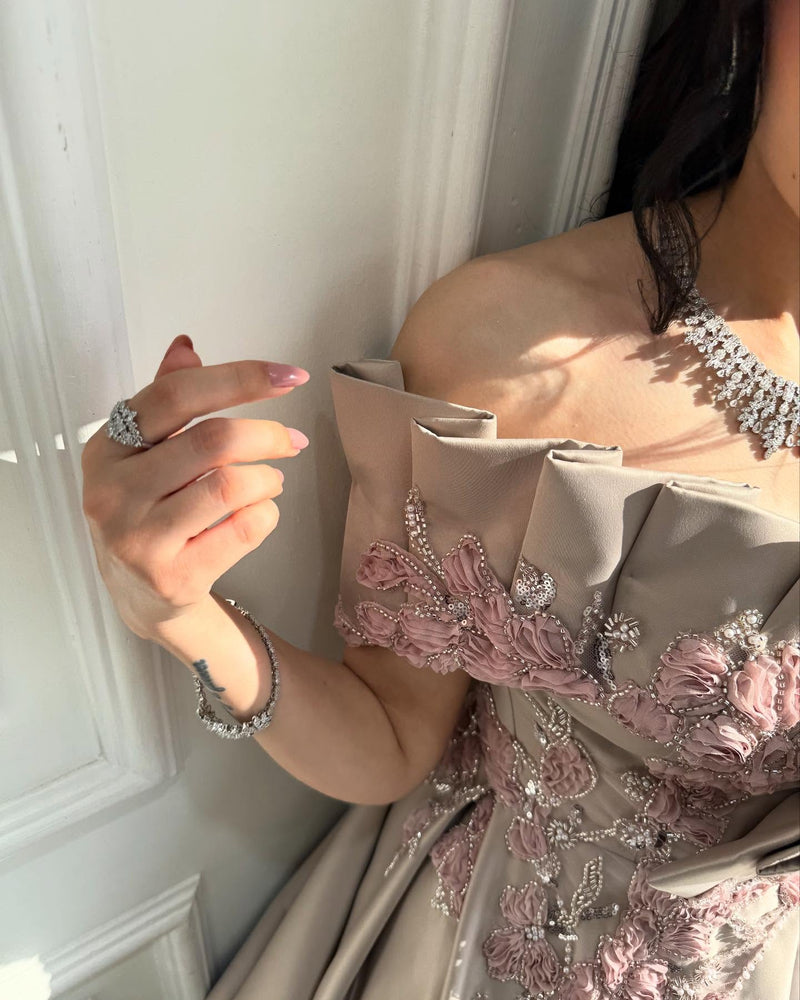 Elegant Champagne Pearl Off-Shoulder 3D Floral Evening Dress XD096