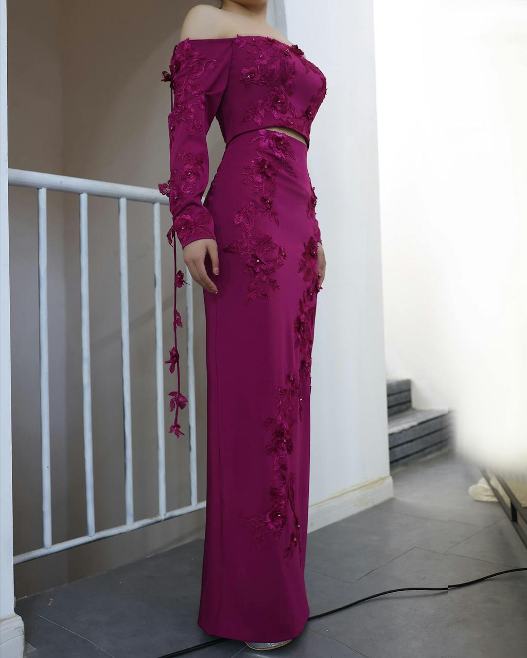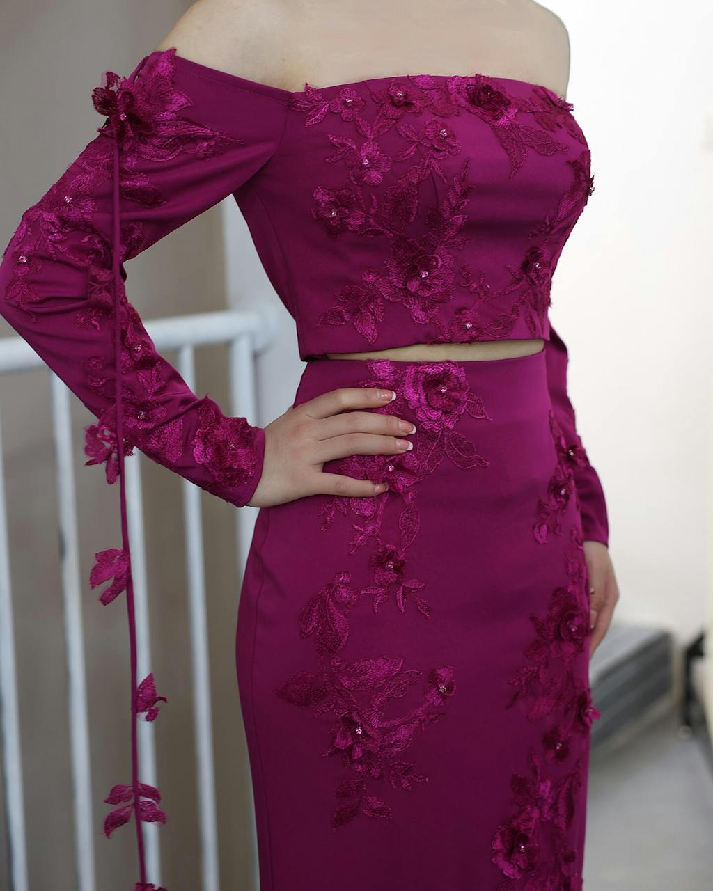 Elegant Off Shoulder Fuchsia Long Sleeves Evening Dress SF264