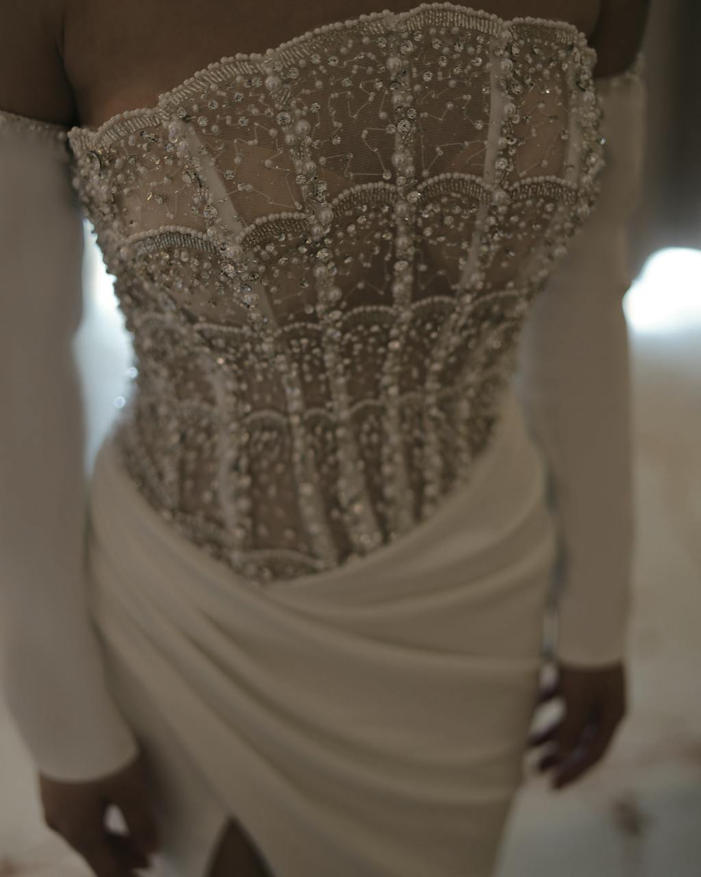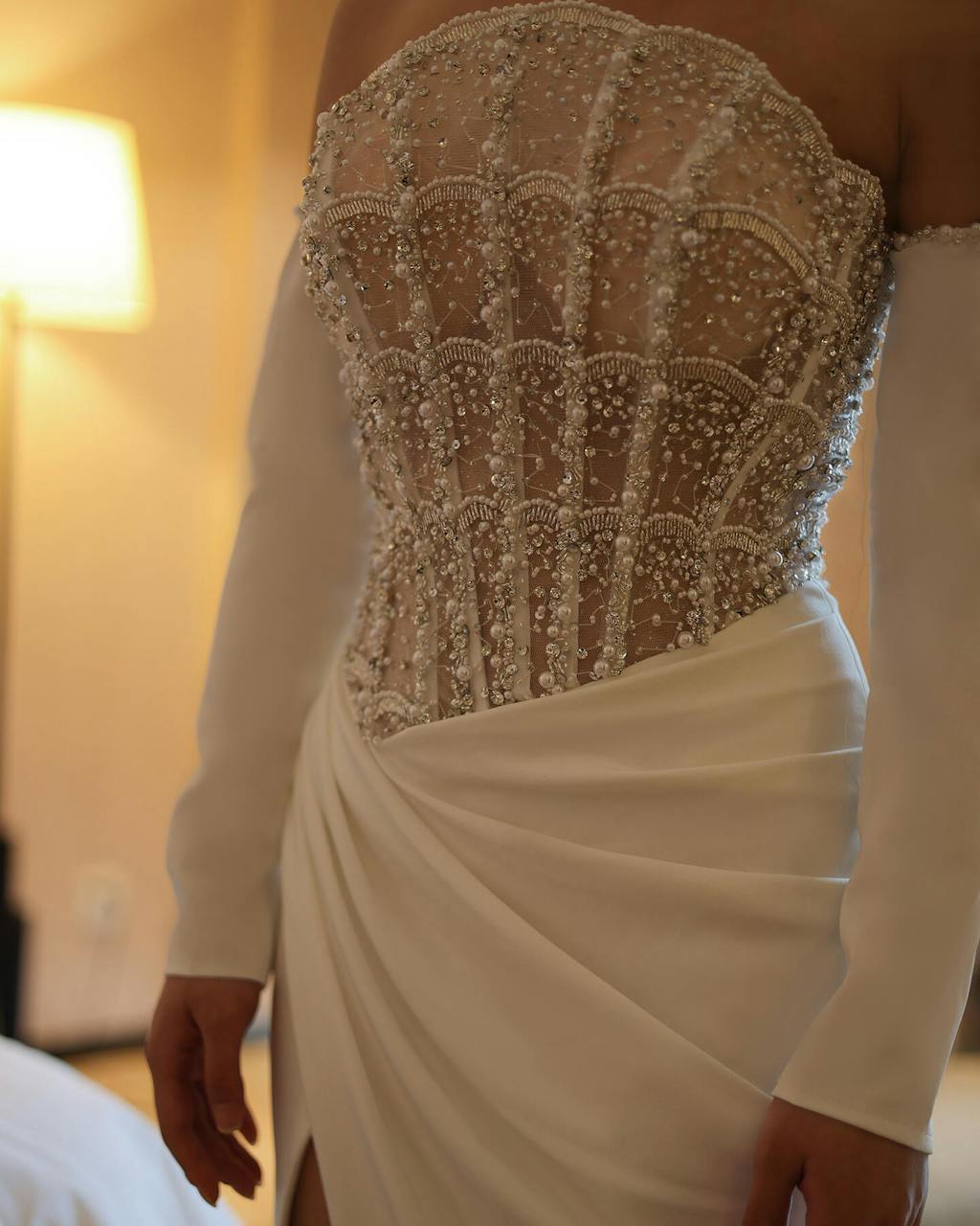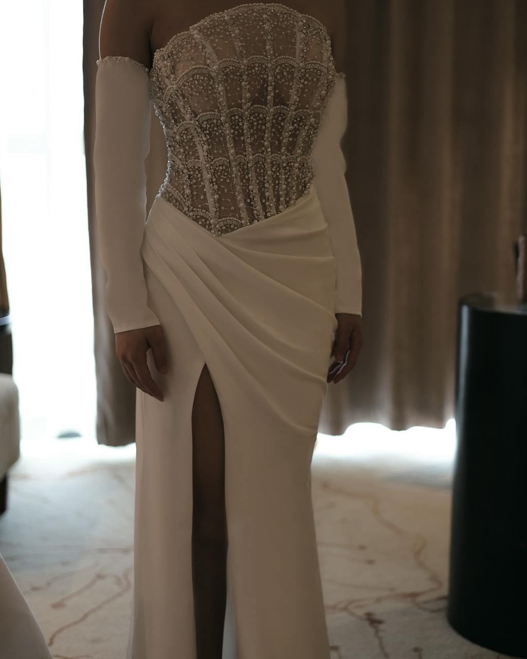 Elevate your evening attire with Sharon Said's Luxury Dubai Mermaid White Evening Dress. This stunning dress features a sexy scalloped design and a high slit for a sultry and elegant look. Perfect for weddings, proms, and special occasions, this dress will make you stand out in any crowd. Experience luxury and sophistication with SS416.