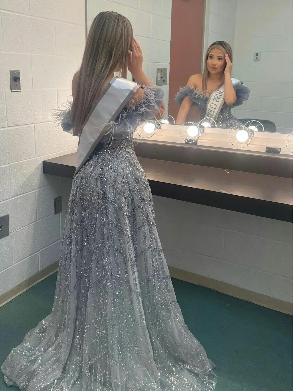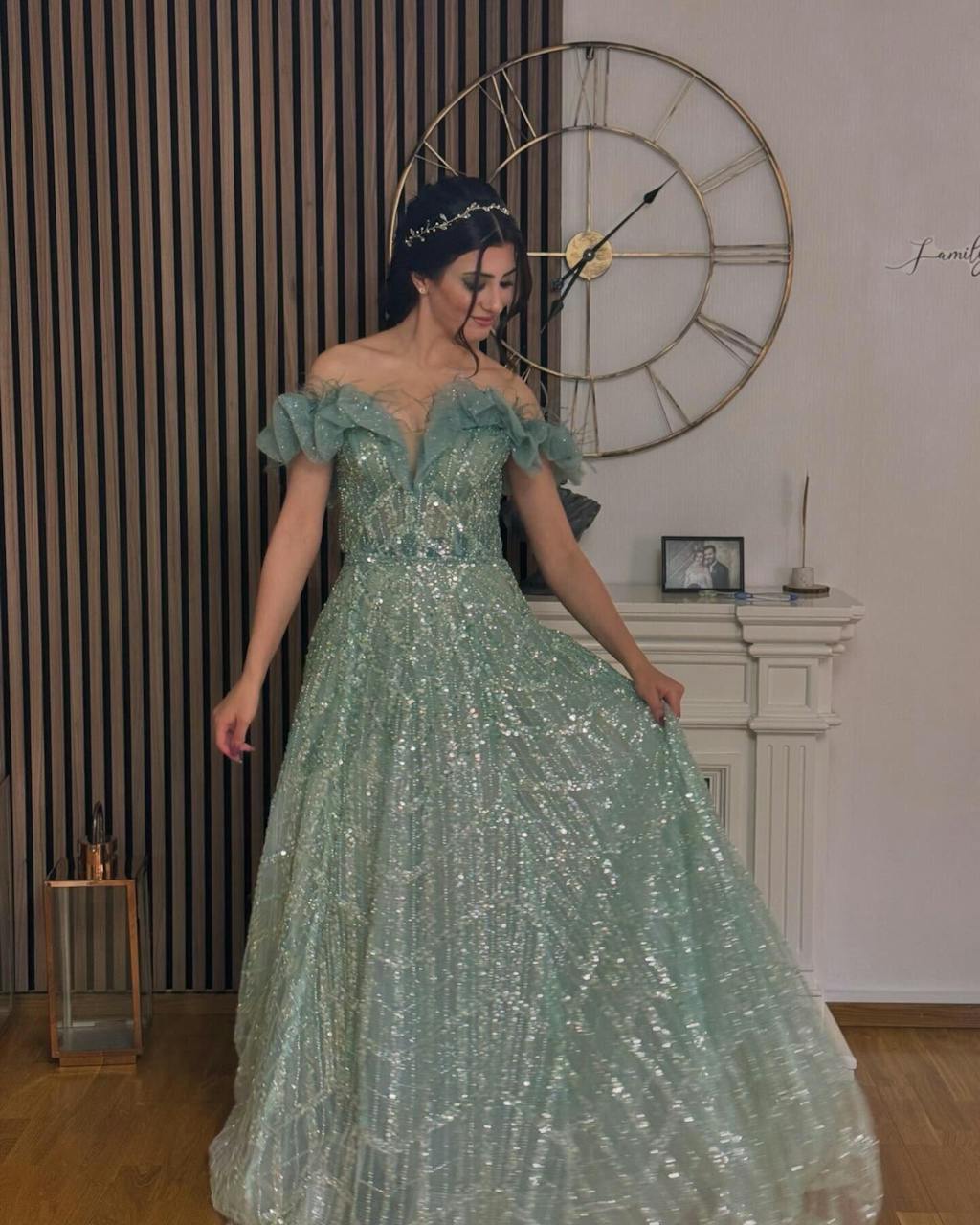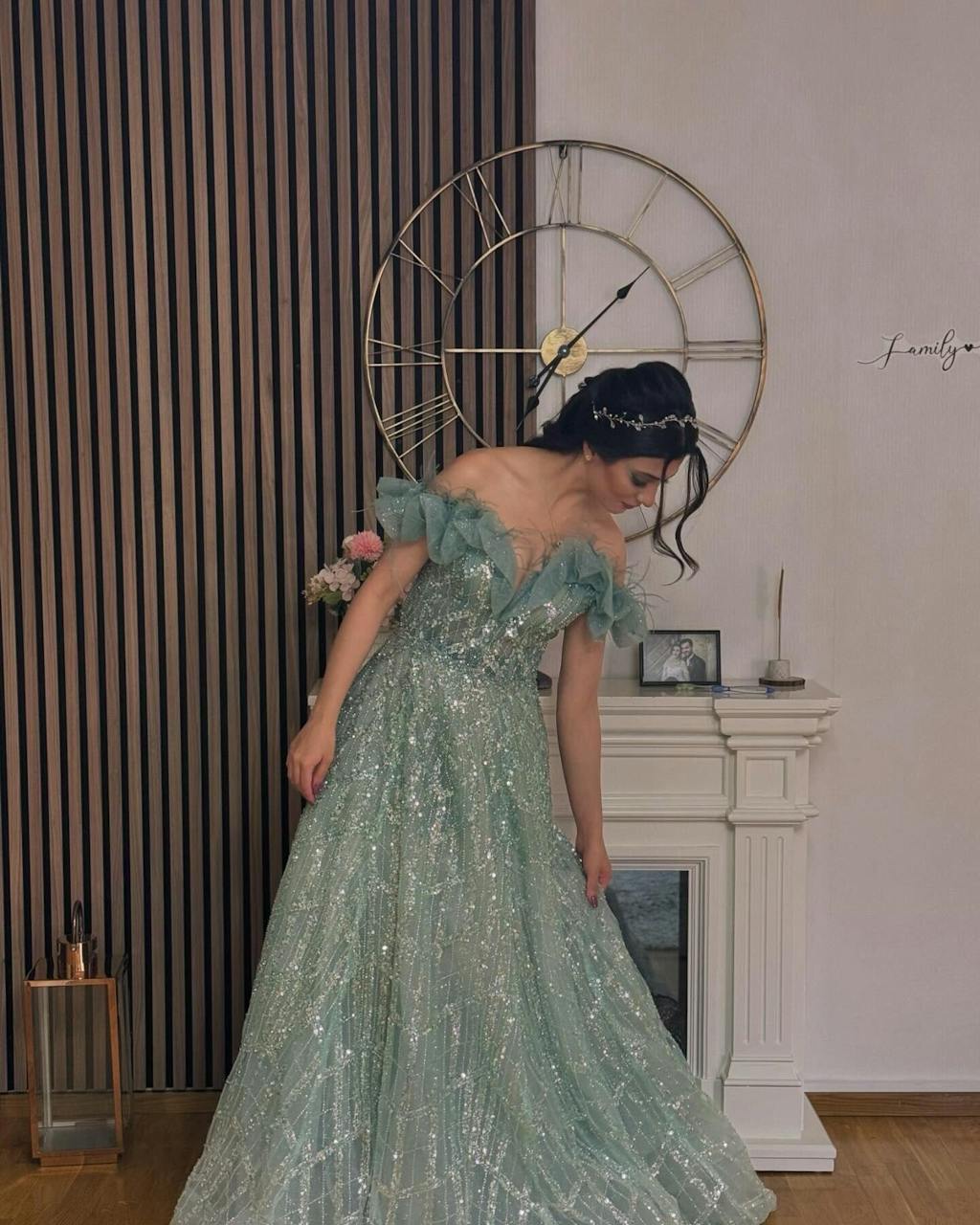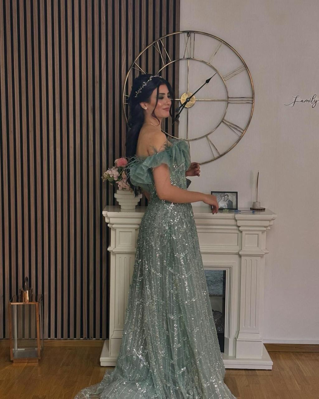 Luxury Feathers Green Off Shoulder Evening Dress SS303