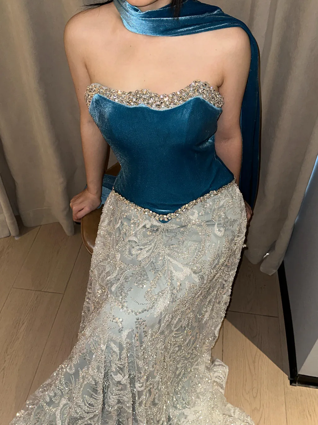 Luxury Beaded Blue Velvet Evening Dress with Scarf SS793